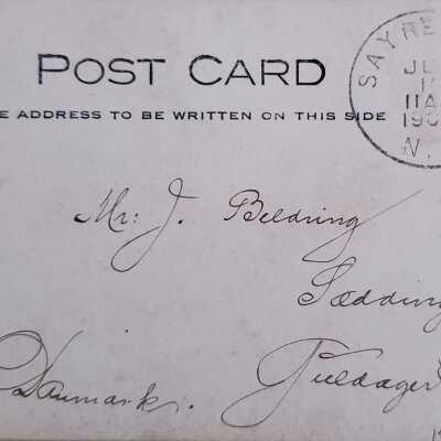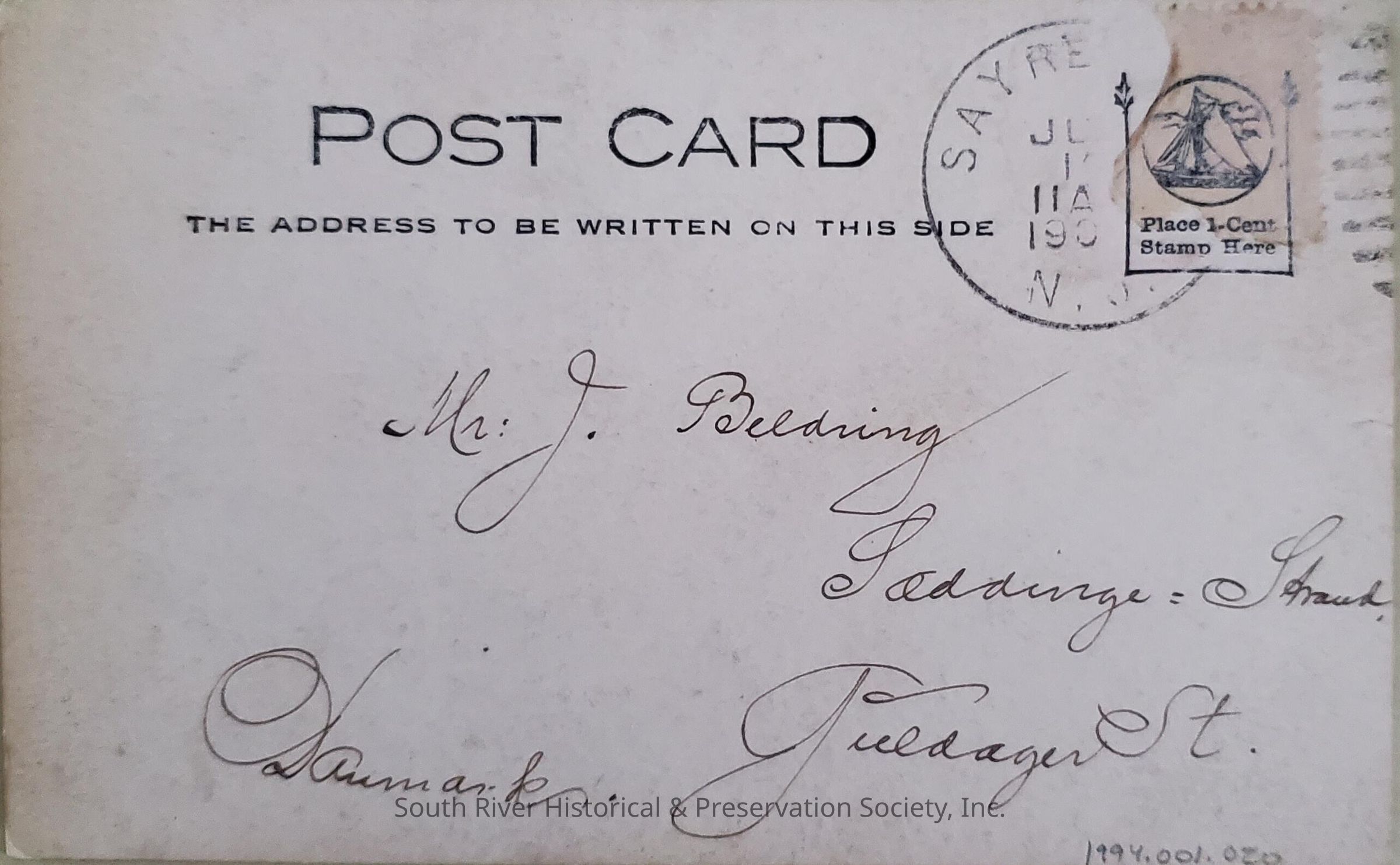 Printed text on the back of the postcard reads: "Post Card, The Address To Be Written On This Side". A square for a stamp on the back top right corner reads: "Place 1-Cent Stamp Here" under an illustration of a sailboat with residue left when the stamp was removed. A postmark from Sayreville is partially obscured. The card is addressed to Mr. J. Beldring with a Denmark address.