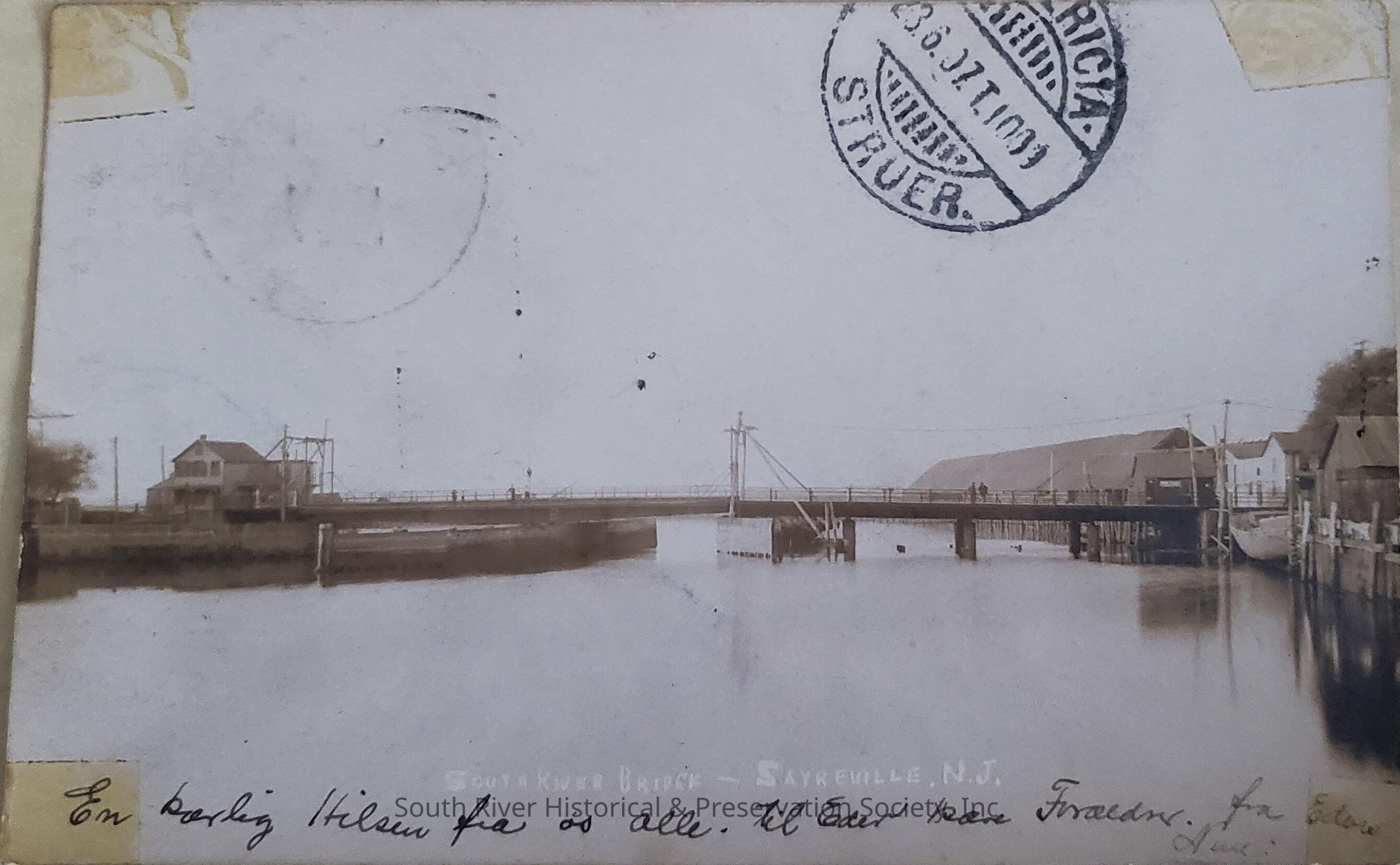 Real photo postcard showing a black and white image of the South River bridge connecting South River and Sayreville. The view is from the river with buildings on each end of the bridge visible. The brick drying shed belonging to Sayre & Fisher is at the right. The postcard caption reads, "South River Bridge - Sayreville, N.J."
