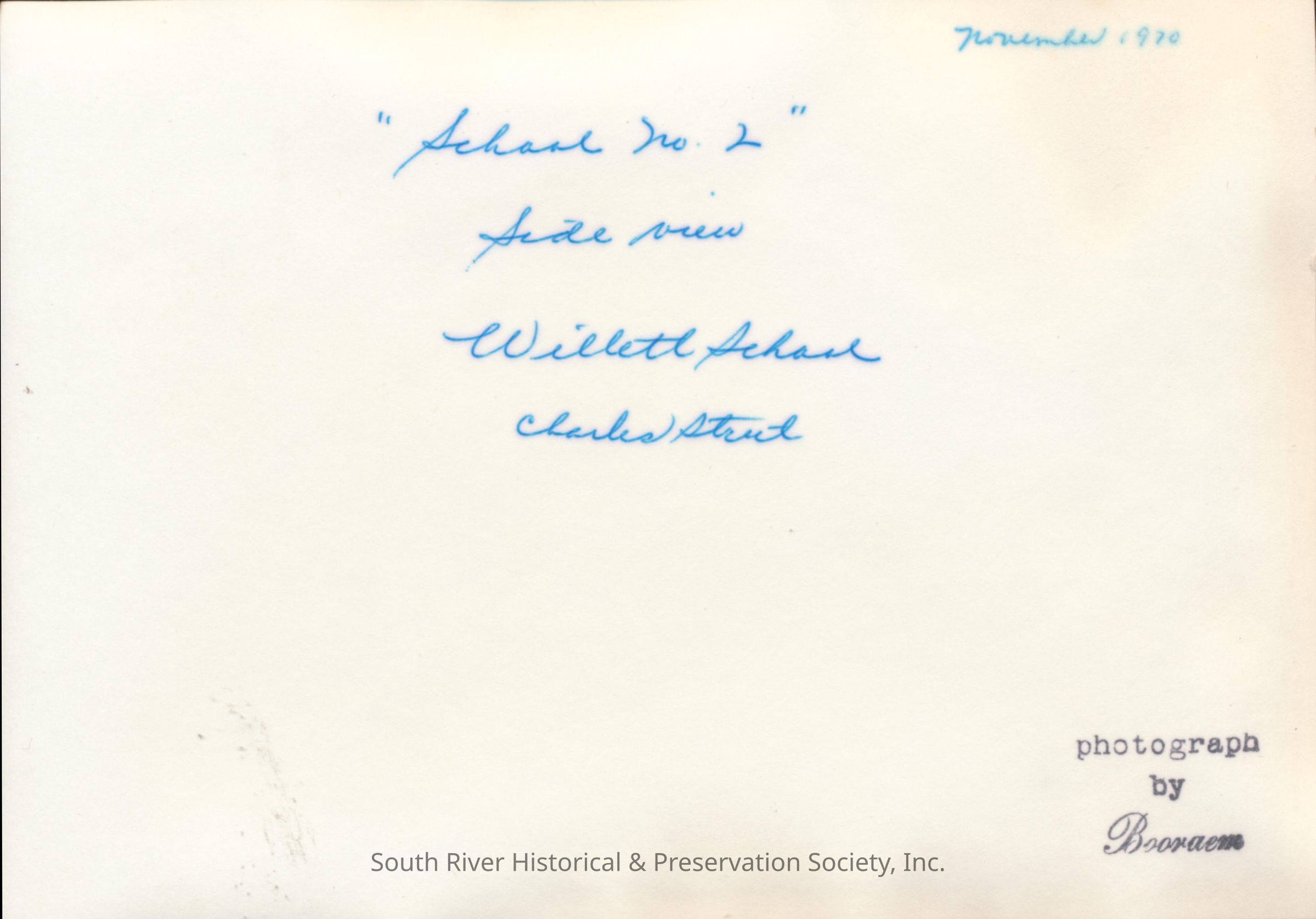 A note handwritten on the back in blue ink reads "November 1970; "School No. 2," side view, Willett School, Charles Street."