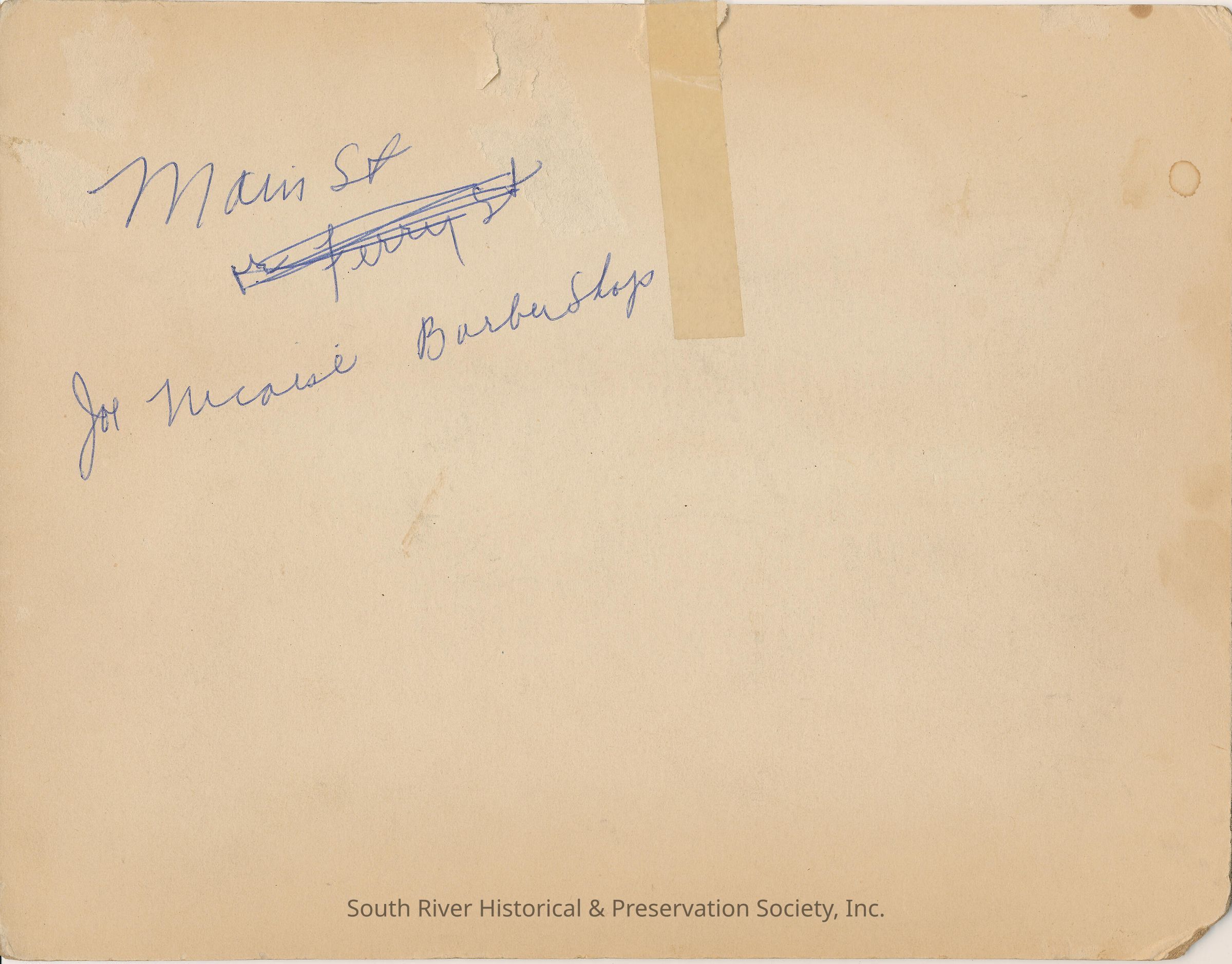 Handwritten text on the back of the photograph reads: "Main St. Joe Nicaise Barber Shop" in blue ink.