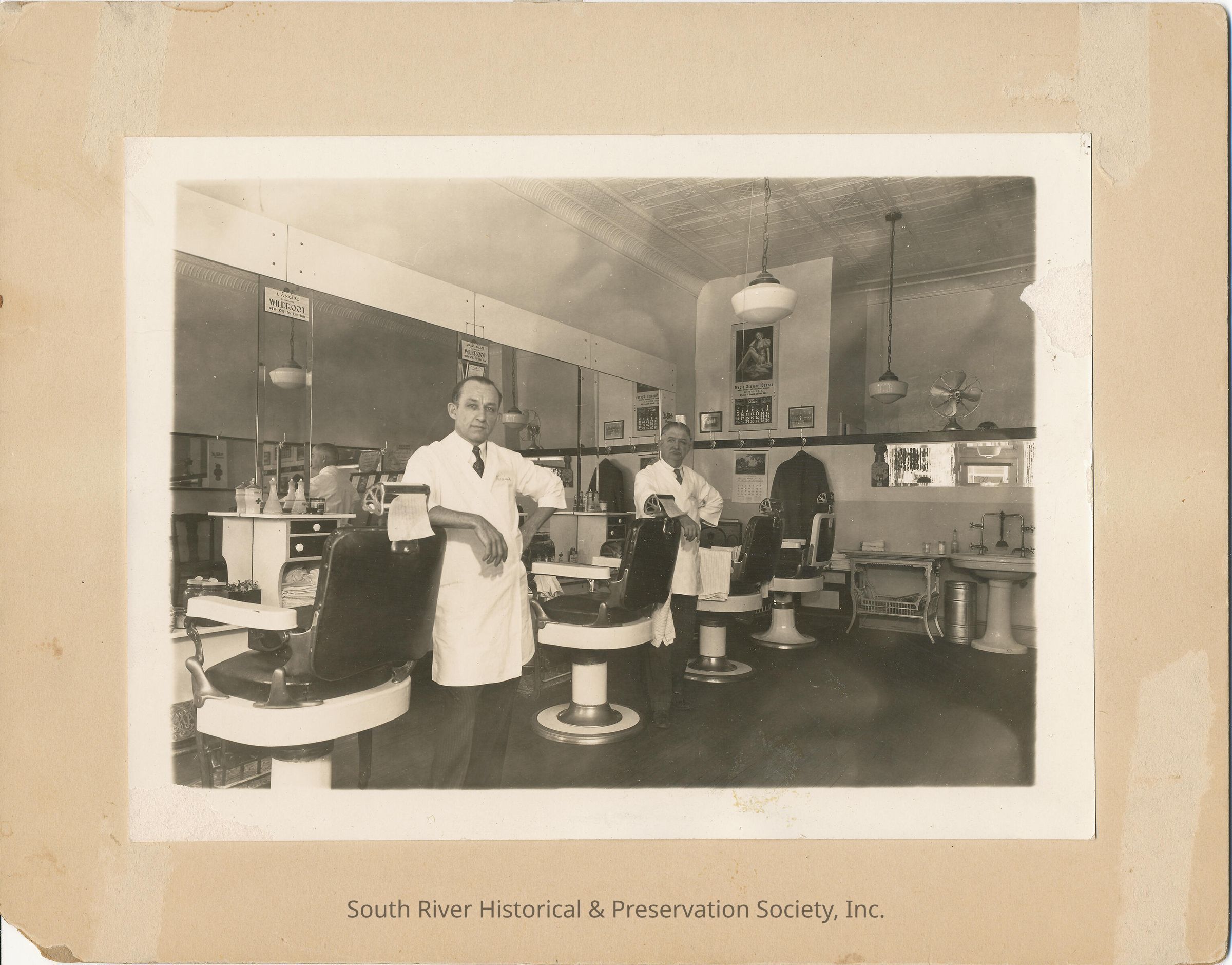Black and white photograph showing two men in white smocks standing facing the camera next to two of four pictured chairs in a barber shop. Wall in front of the chairs is mirrored and products and storage are visible. Two signs fixed to the mirror in from of the chairs both have text reading: "J.V. Nicaise Recommends Wildroot with Oil For The Hair". A 1941 pinup calendar from Mac's Service Center, Main Street and Hillside Avenue, South River, is hanging on the back wall of the barber shop and fans, sink, and tables are visible in photograph.