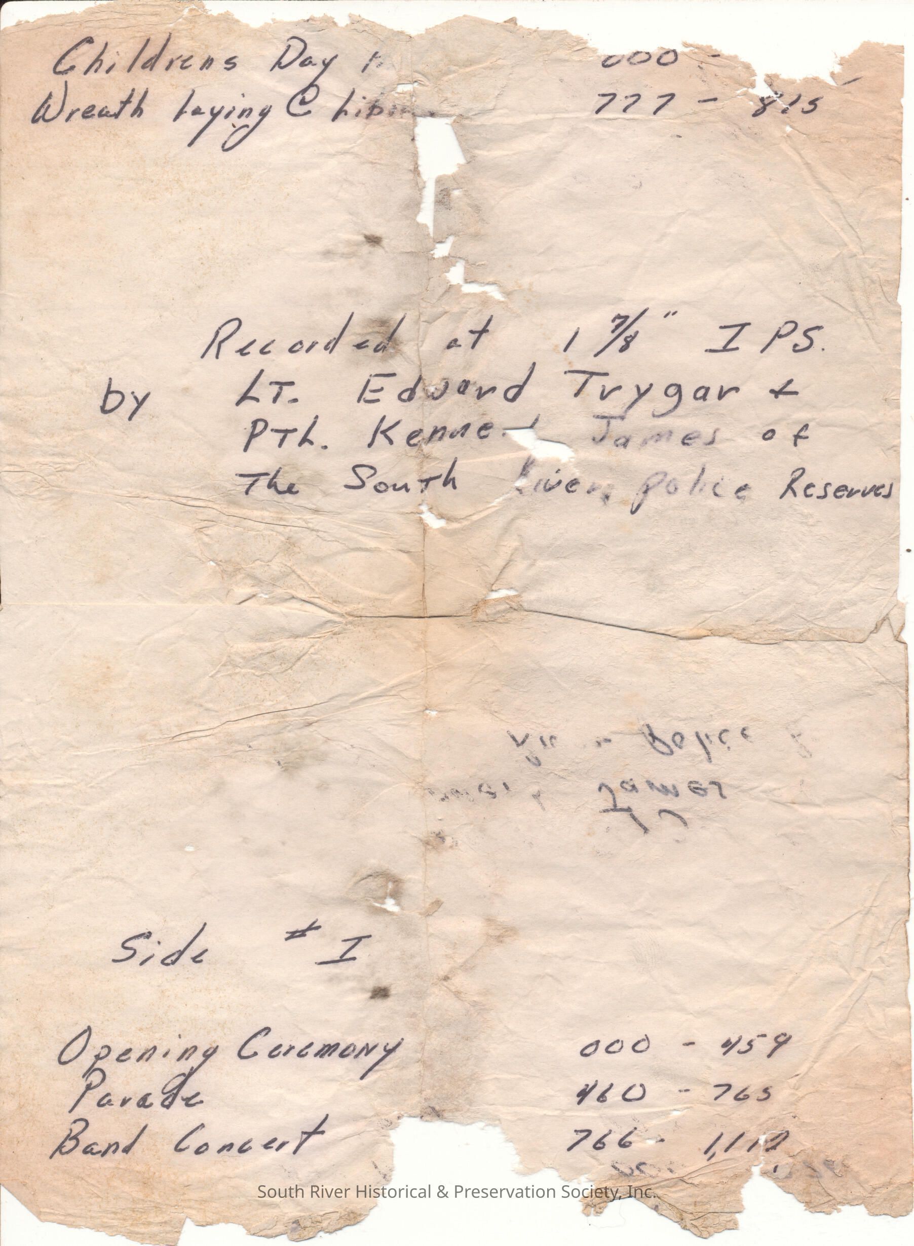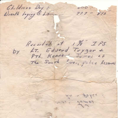 Accompanied by a note handwritten in black ink. It describes the contents of the reel and provides information about the recording.