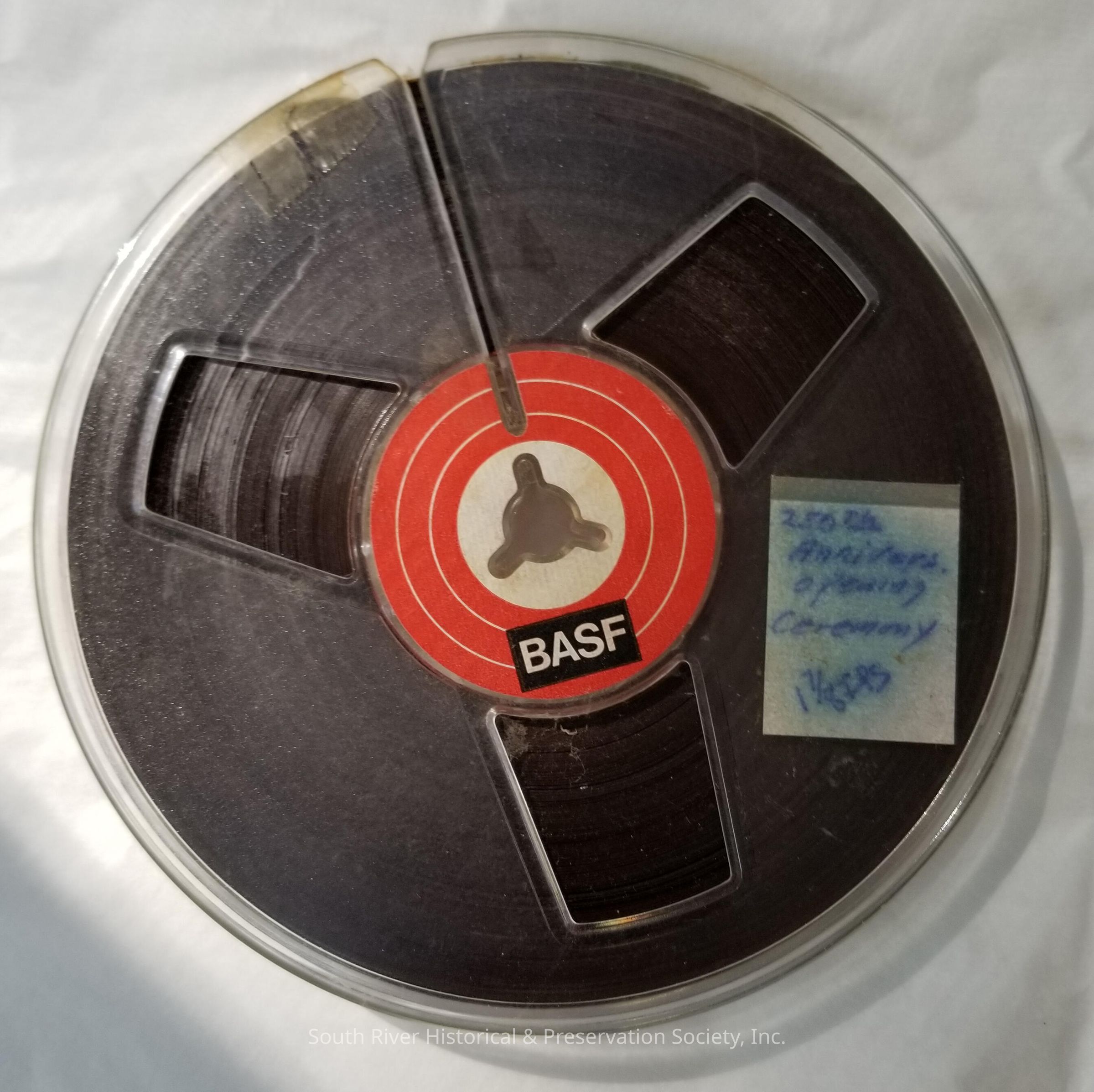 Reel of audio tape with a label handwritten in blue ink that reads "250th Annivers. opening ceremony - 1 7/8 IPS."