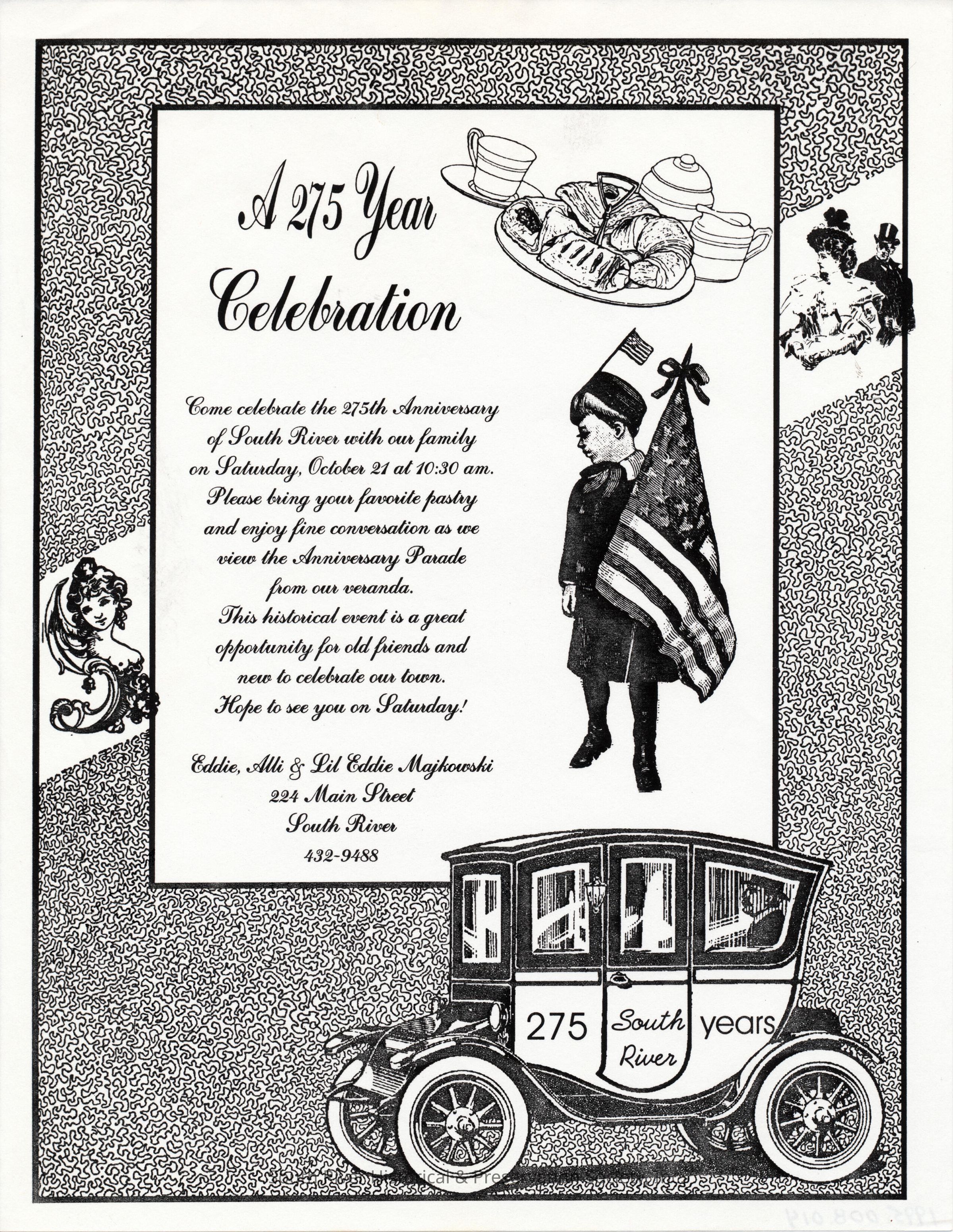 Invitation to view the anniversary parade from the veranda. "Come celebrate the 275th Anniversary of South River with our family on Saturday, October 21 at 10:30 am."