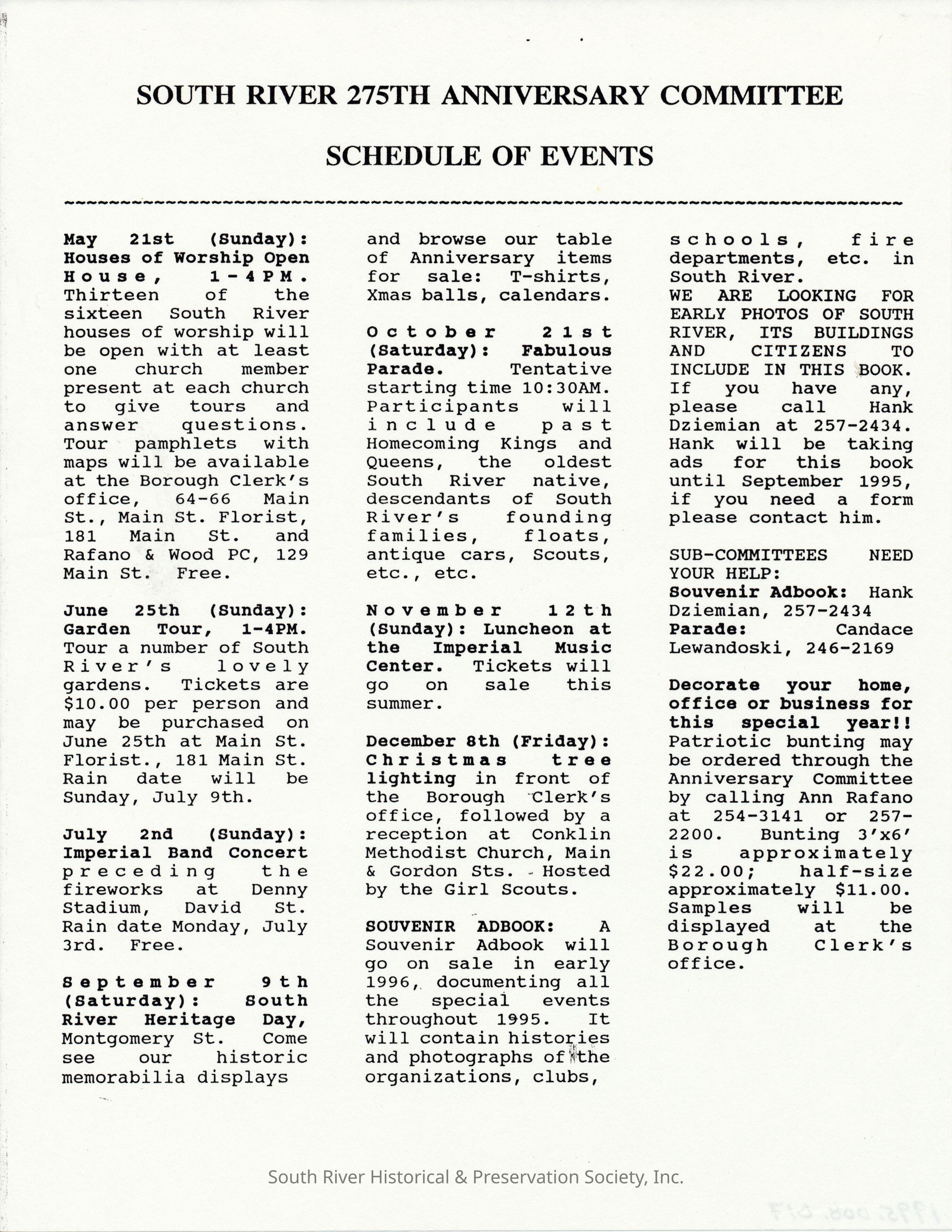 South River 275th Anniversary Committee Schedule of Events