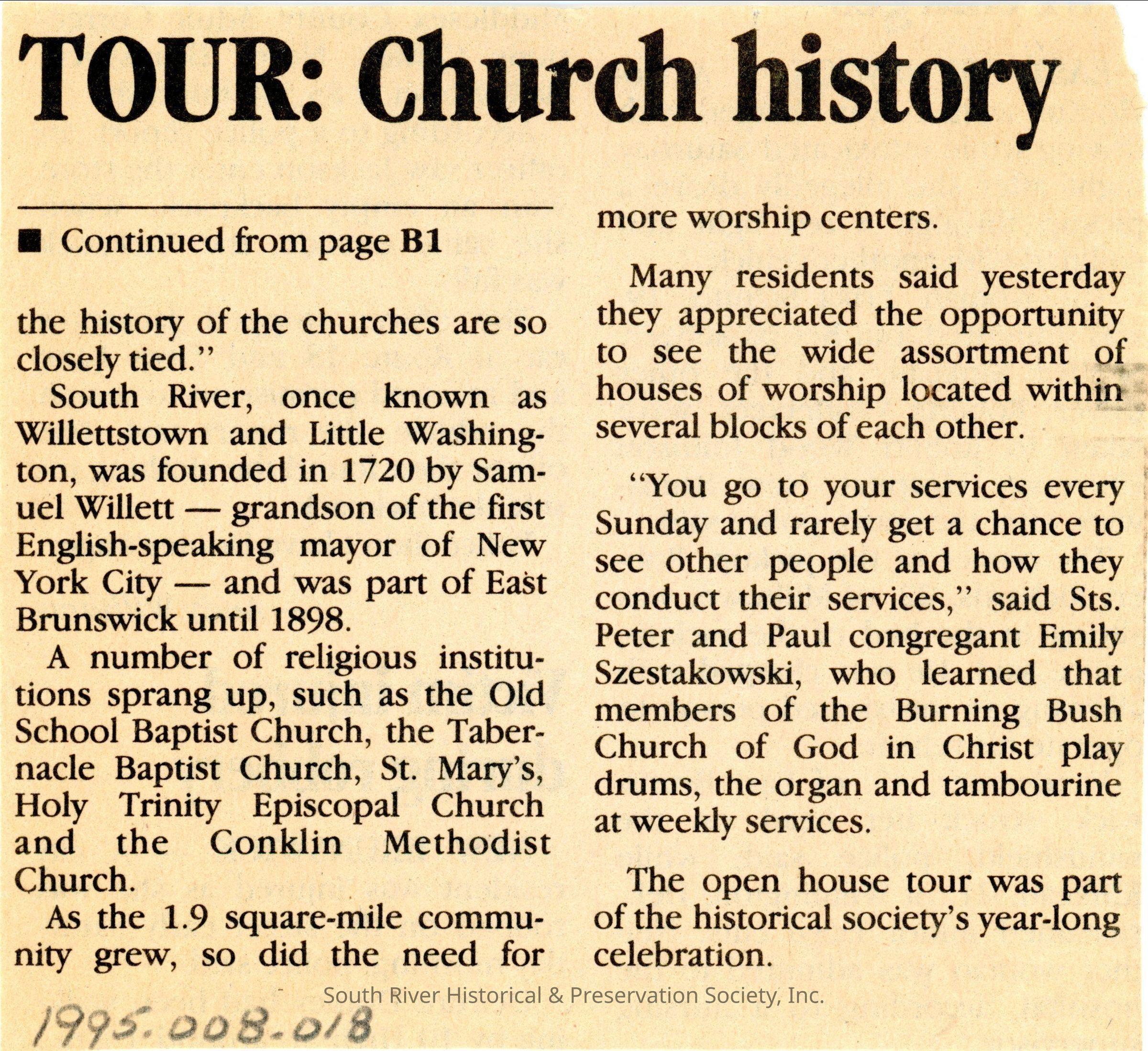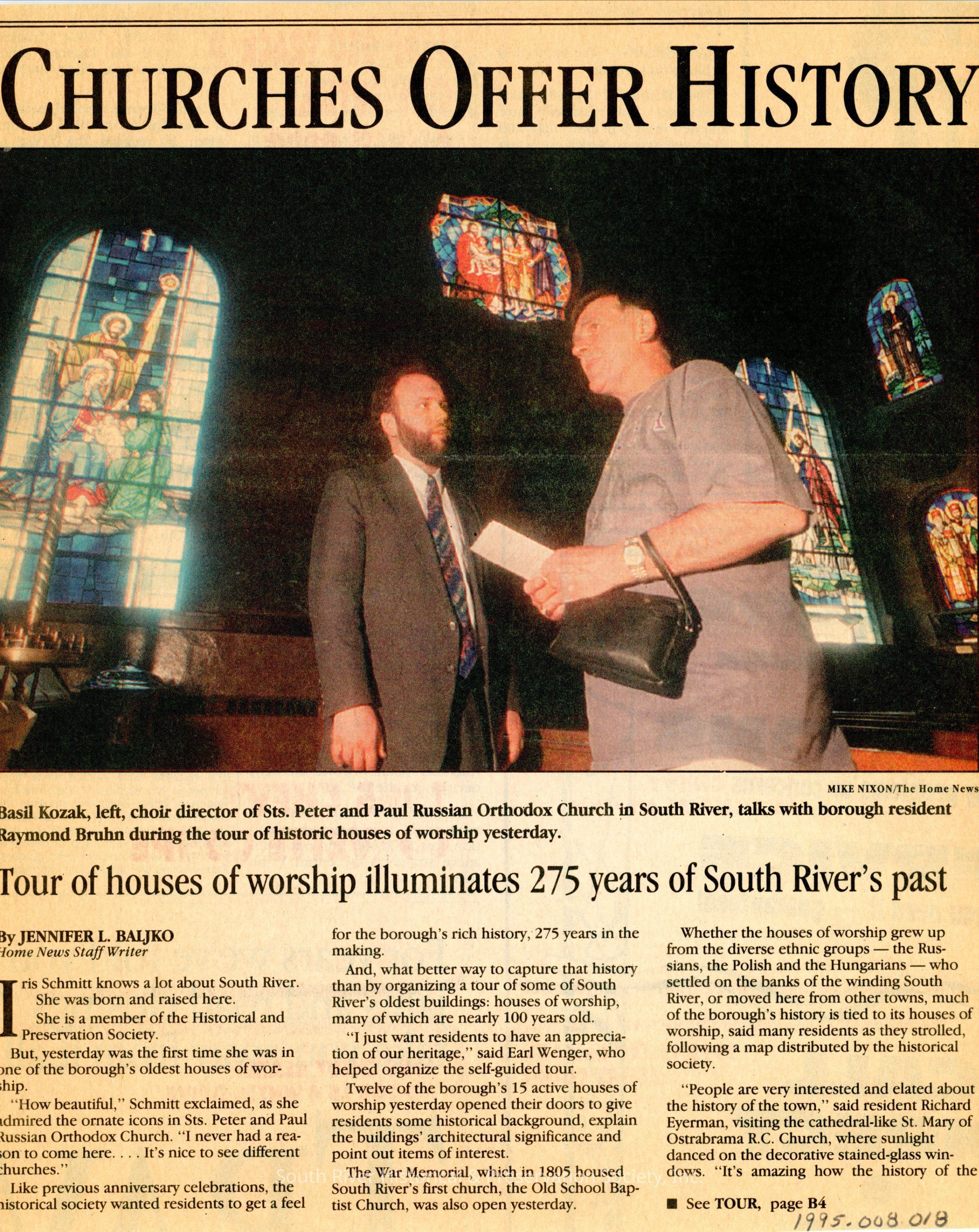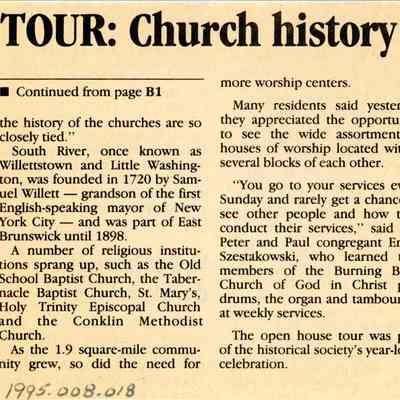Four pages of newspaper on two sheets. The first page (B1) includes a full-color photograph headed "Churches Offer History" and a story with the headline "Tour of houses of worship illuminates 275 years of South River's past." The story continues on page B4 with the heading "Tour: Church history." Home News, May 22, 1995.Date(s) of Creation