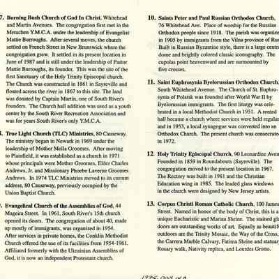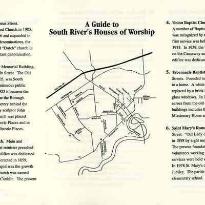 Trifold leaflet with descriptive information on South River churches and related sites along with a map of locations. Includes an insert of "special Notes" on the church tour. "Published in celebration of Middlesex County's Tercentennial."Date(s) of Creation