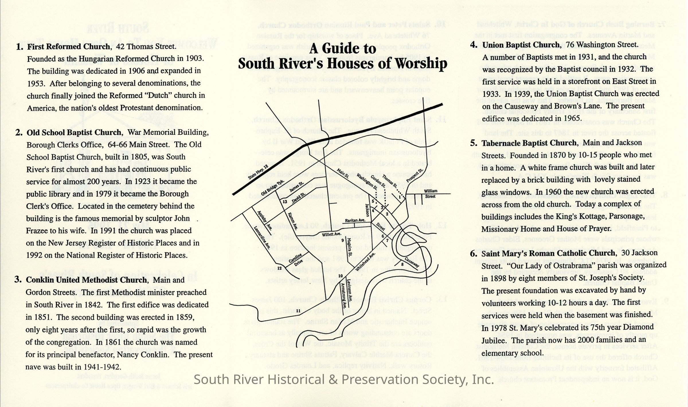 Trifold leaflet for the tour "In Celebration of South River's 275th Anniversary." Content includes descriptive information about each location and a map of South River with numbers to match locations to descriptions. Two copies.Date(s) of Creation