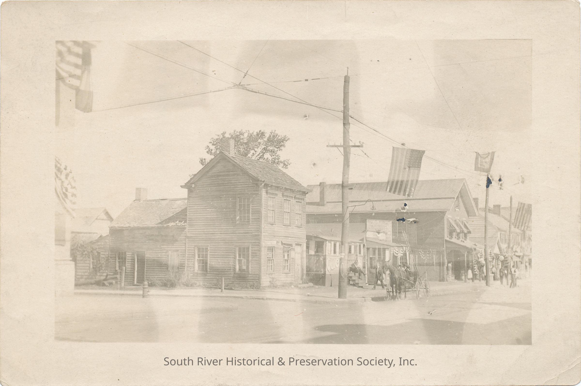Photograph showing the corner of Main and Stephen Street during South River's 200th Anniversary celebration in 1920. Banners and flags can be seen hanging along the street with people and carriages along the road on the right side of the frame. The corner of the First National Bank is just visible at the left edge of the frame. \