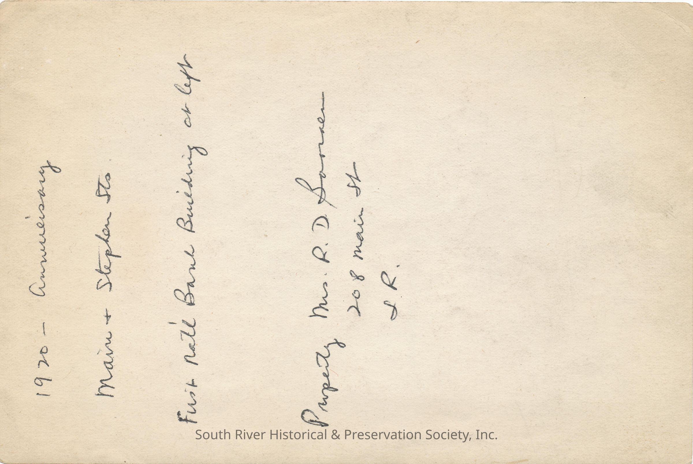 Photograph measures 4" X 6" and is in excellent condition with no creases or tears. Fading appears on the front of the photograph and is part of the original print. Handwritten text on the back of the photograph reads: "1920 - Anniversary, Main + Stephen St, First Nat'l Bank Building on left; Property Mrs. R.D.Booraem, 208 Main St. S.R.".