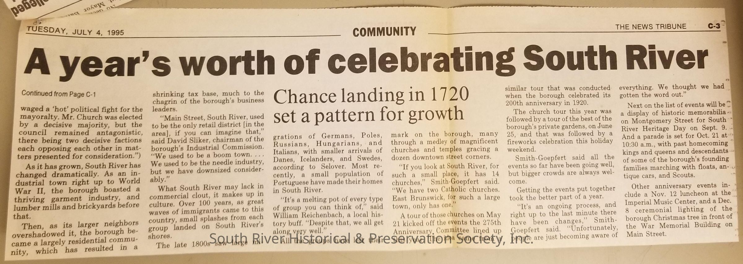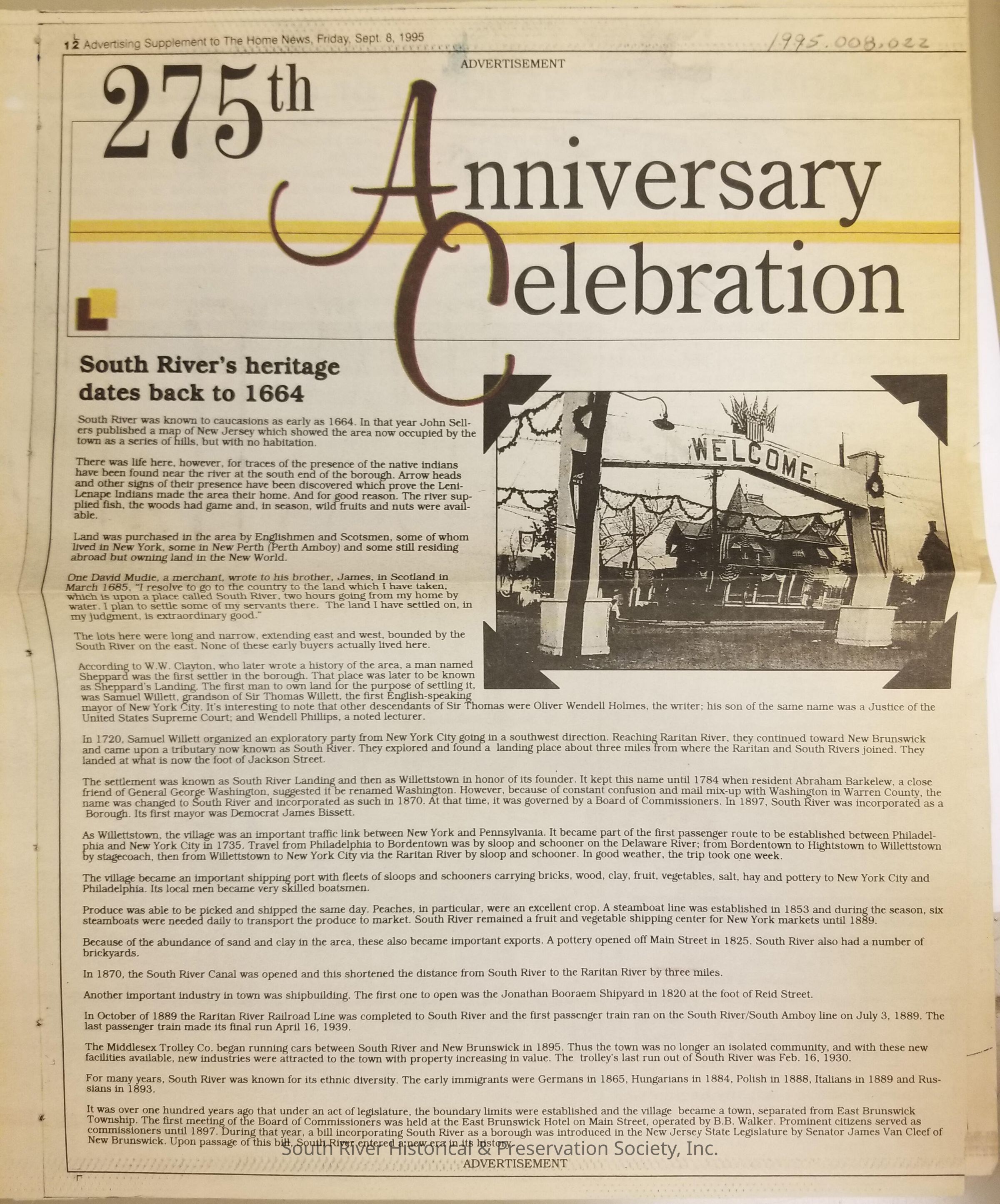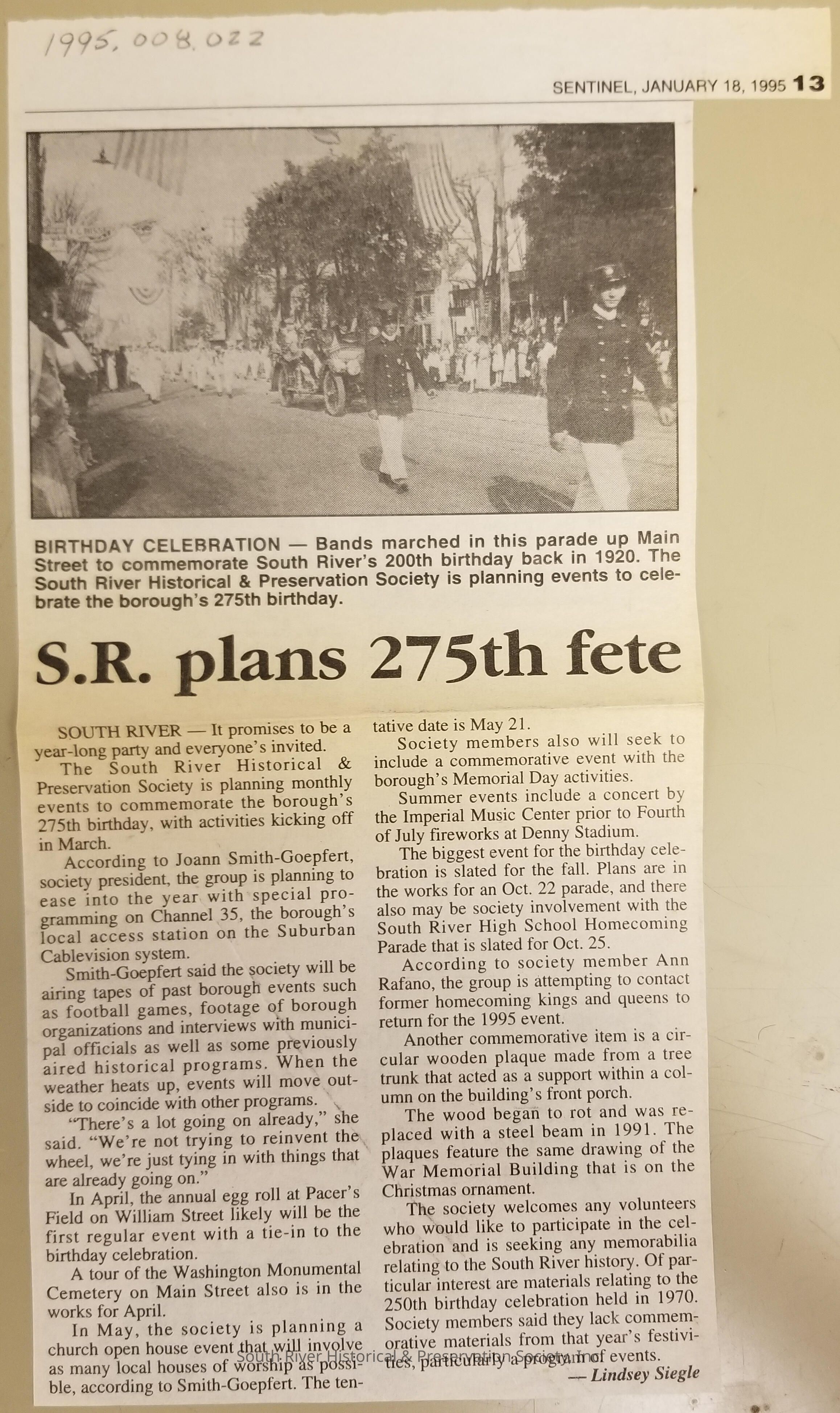 Folder of newspaper clippings related to the celebration of South River's 275th anniversary in 1995.