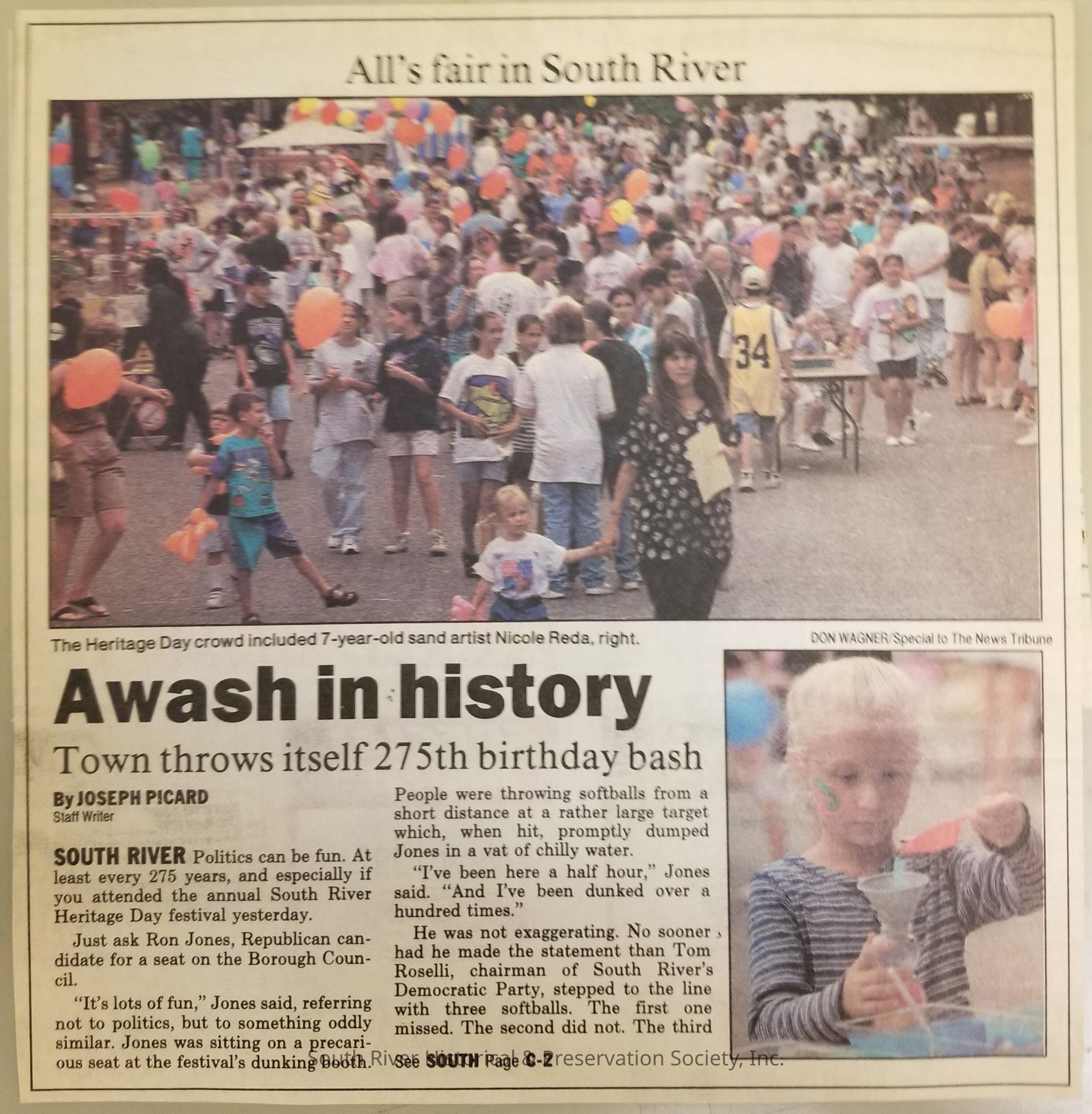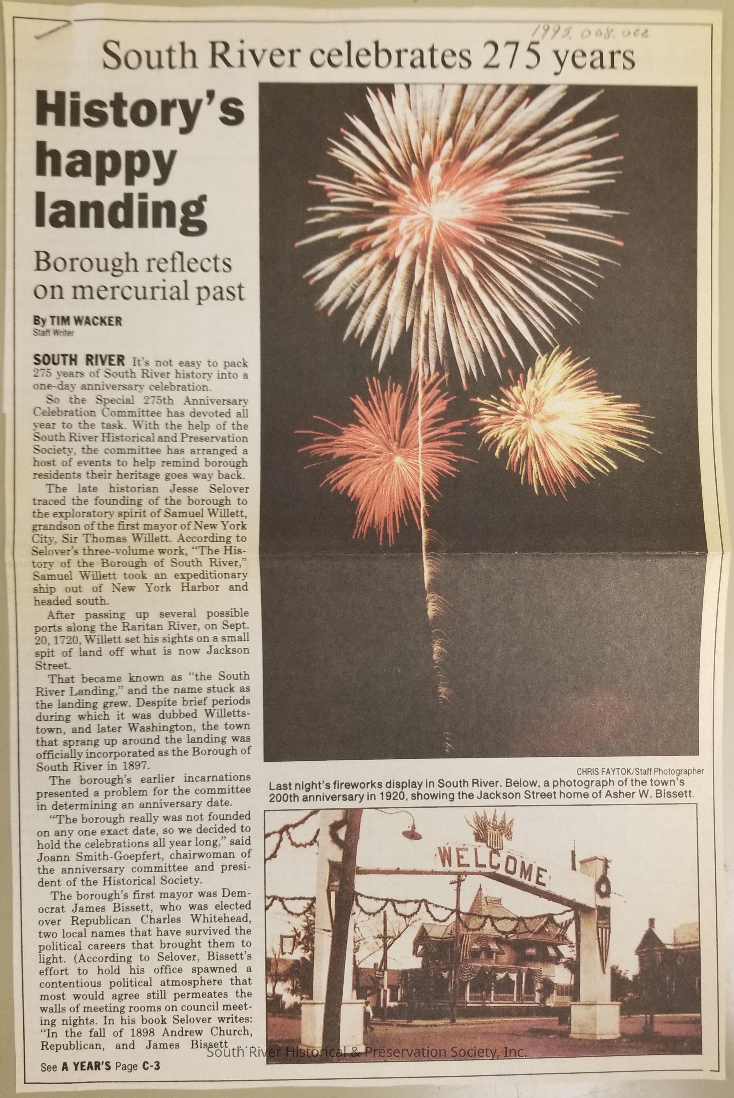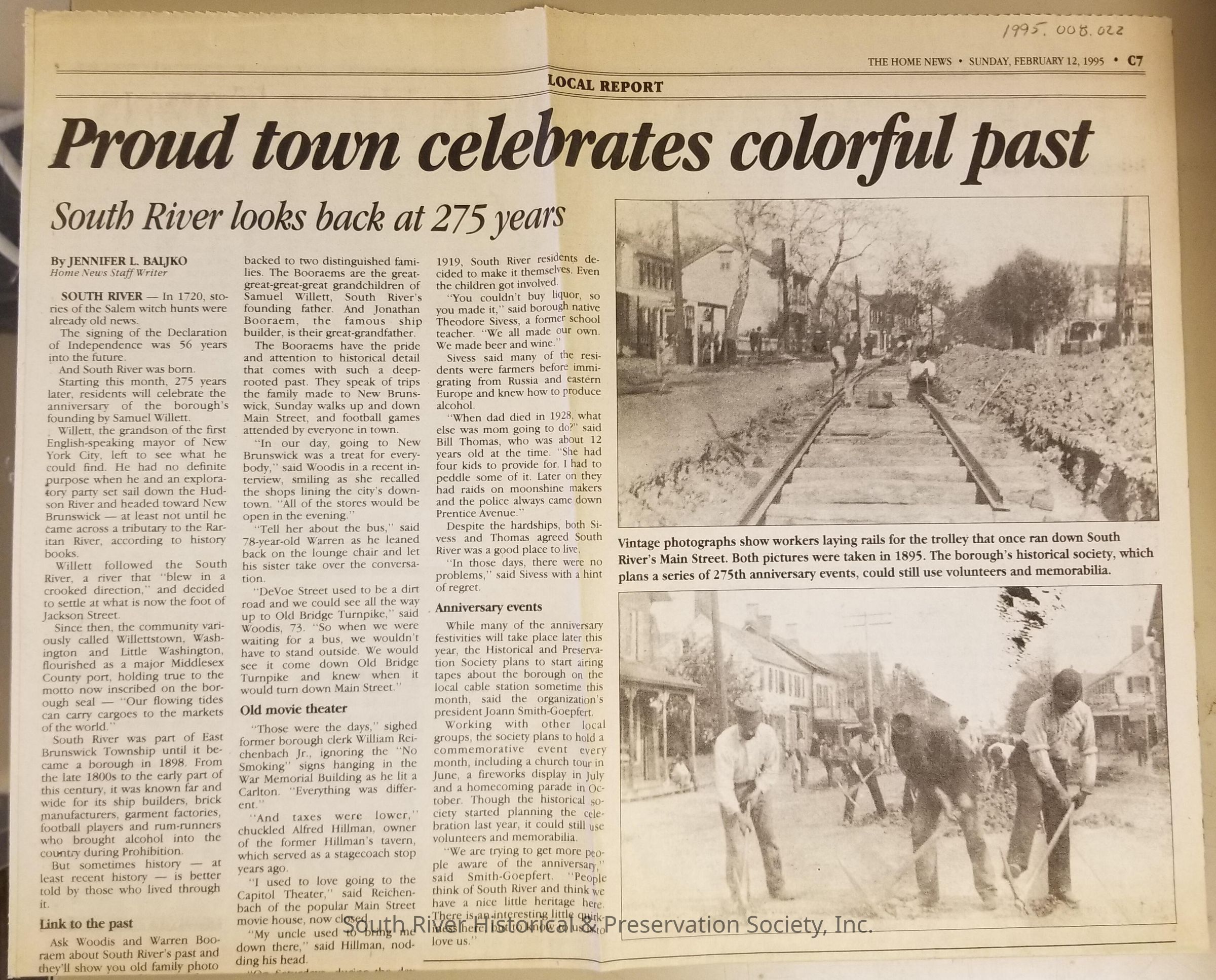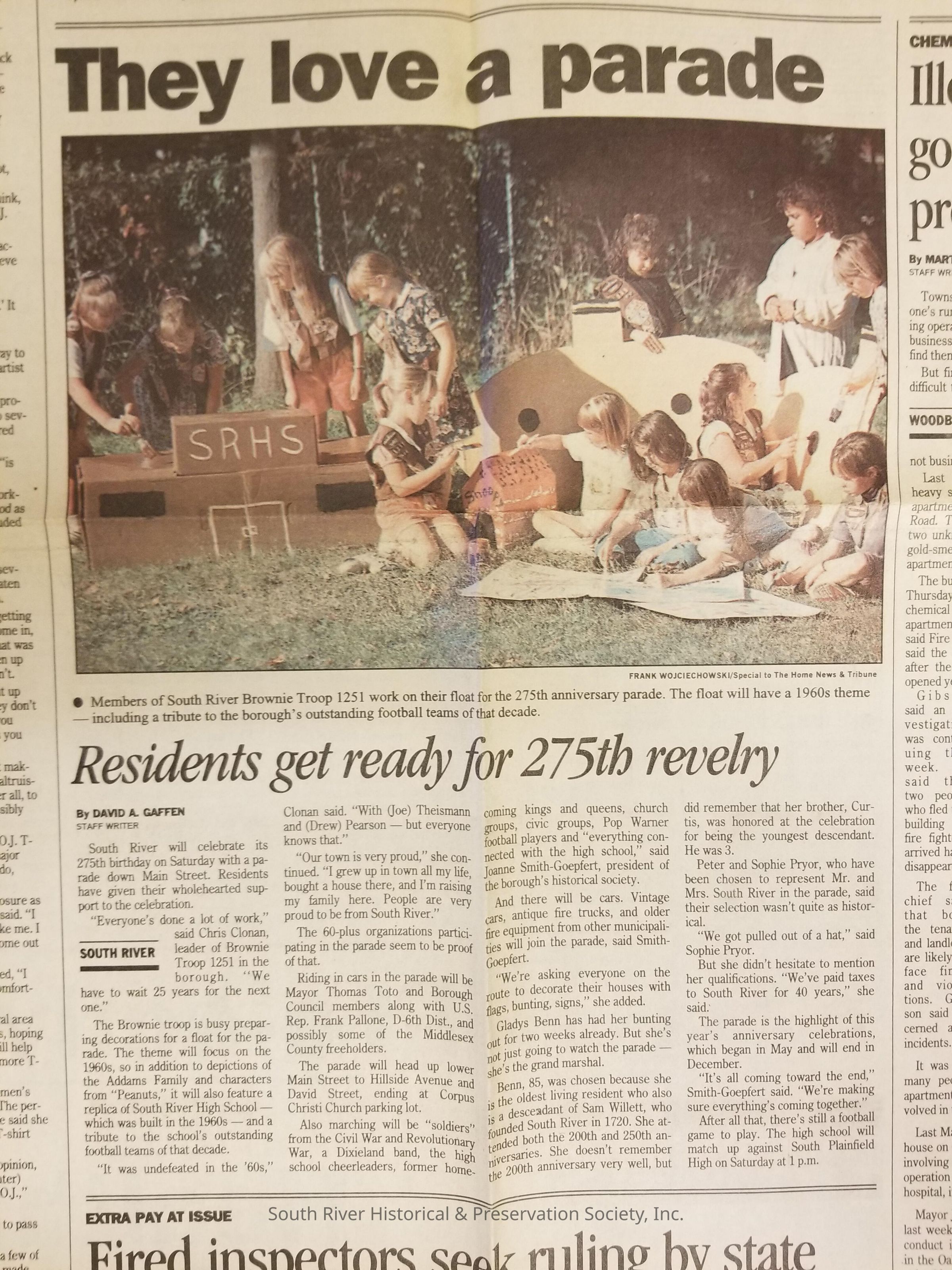 Folder of newspaper clippings related to the celebration of South River's 275th anniversary in 1995.