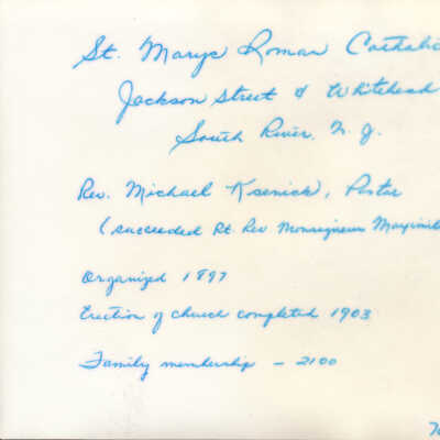 A note handwritten on the back in blue ink reads "St. Mary's Roman Catholic Church, Jackson Street & Whitehead Avenue, South River, New Jersey; Rev. Michael Kseniak, Pastor (succeeded Rt. Rev. Monsigneur Maximillian Wujek; Organized 1897; Erection of church completed 1903; Family membership - 2100; November 1970."