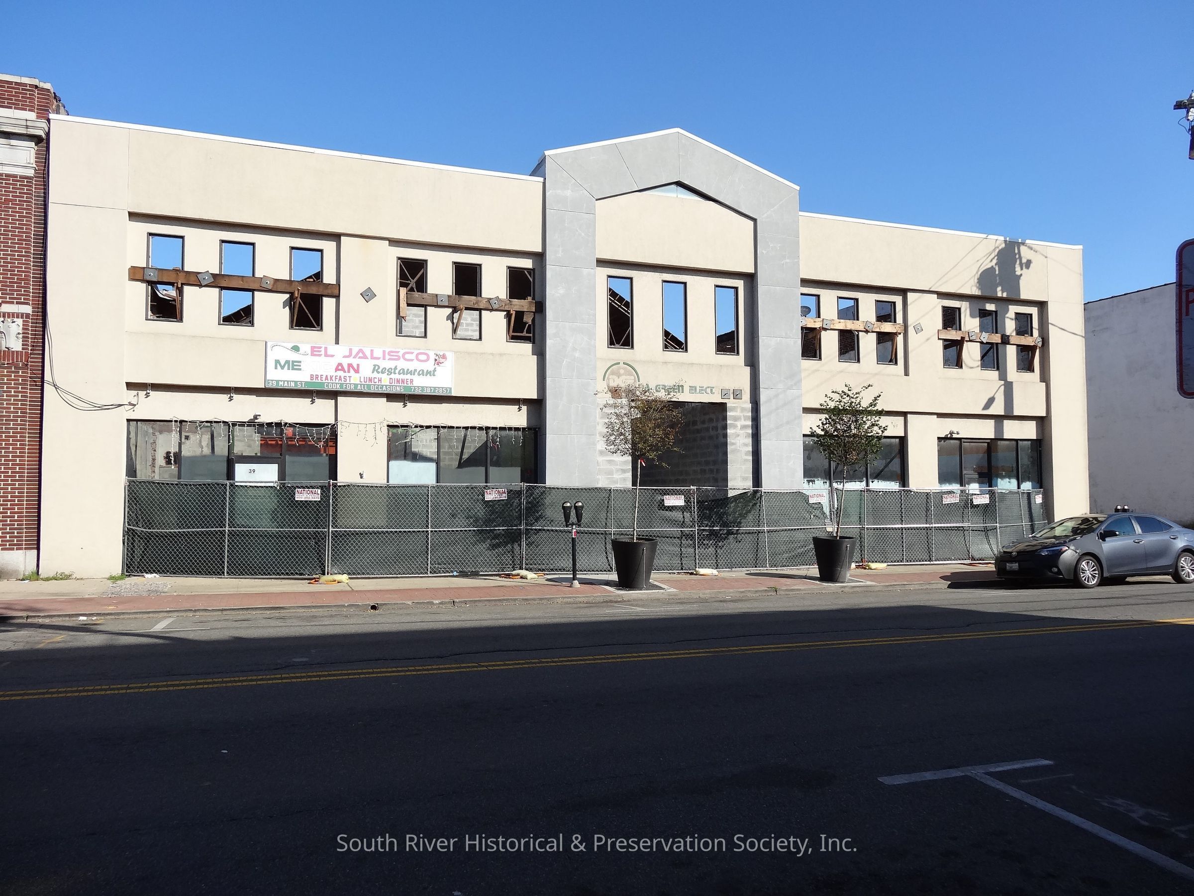Digital color photograph of the DA-Green Electronics building at 37 Main Street undergoing renovations to convert it from a factory into luxury apartments with retail stores at street level. The view is from the opposite side of Main Street. The sky is visible through the upper windows.