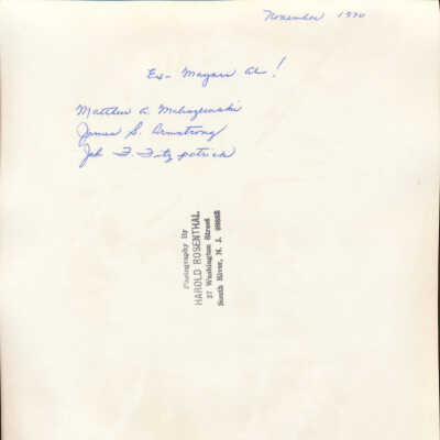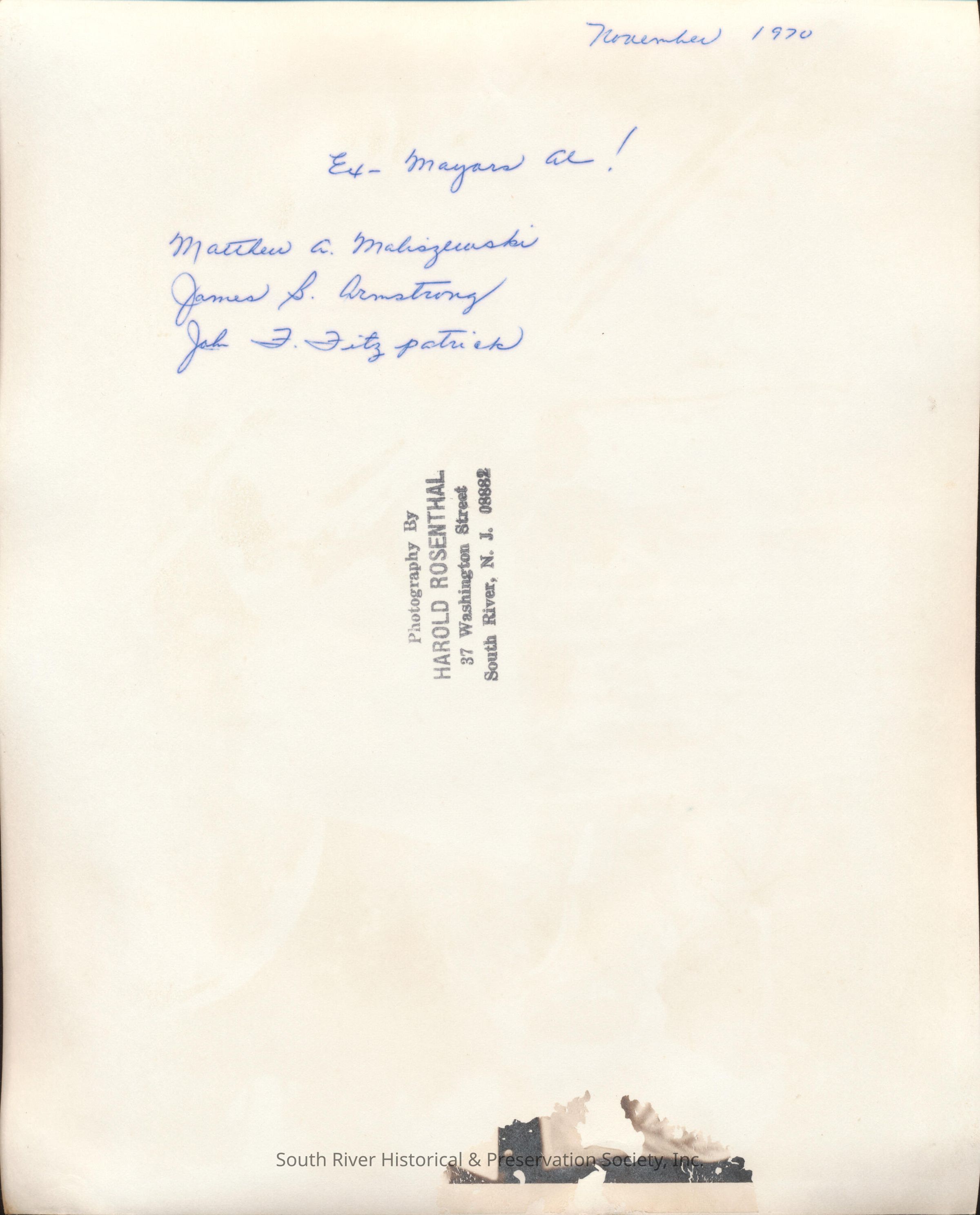 A note handwritten on the back in blue ink reads " November 1970, Ex-Mayors All! Matthew A. Maliszewski, James B. Armstrong, John F. Fitzpatrick."