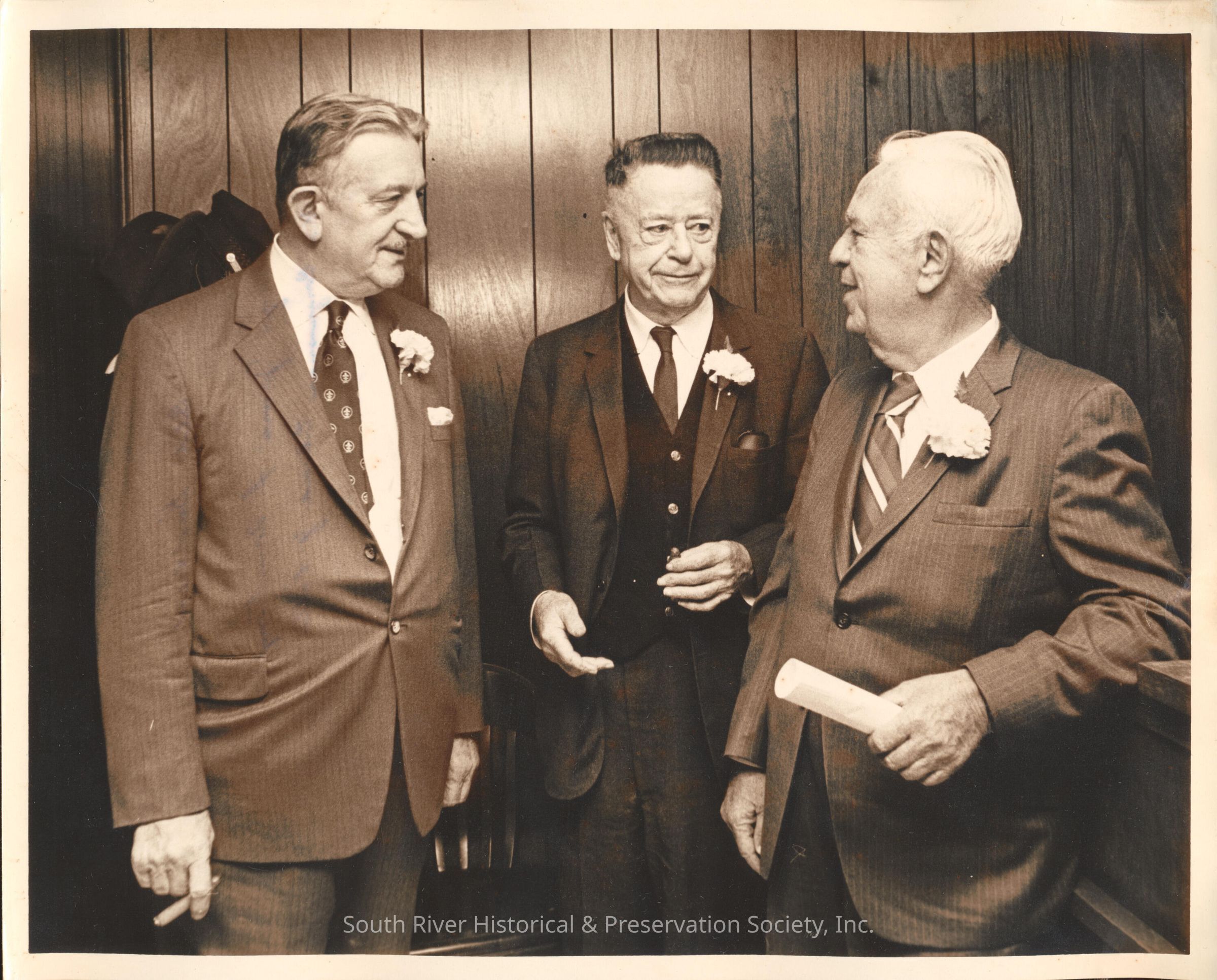 Photograph of Former Mayors Matthew A. Maliszewski (left), James B. Armstrong (center), and John F. Fitzpatrick. All three men are wearing carnations. Maliszewski and Armstrong are holding lit cigars and Fitzpatrick a rolled up paper. The photograph was taken at the opening ceremony for the celebration of South River's 250th anniversary. The event was held in the Council chambers in the Borough Hall on November 6, 1970.