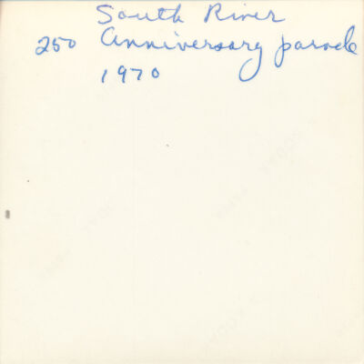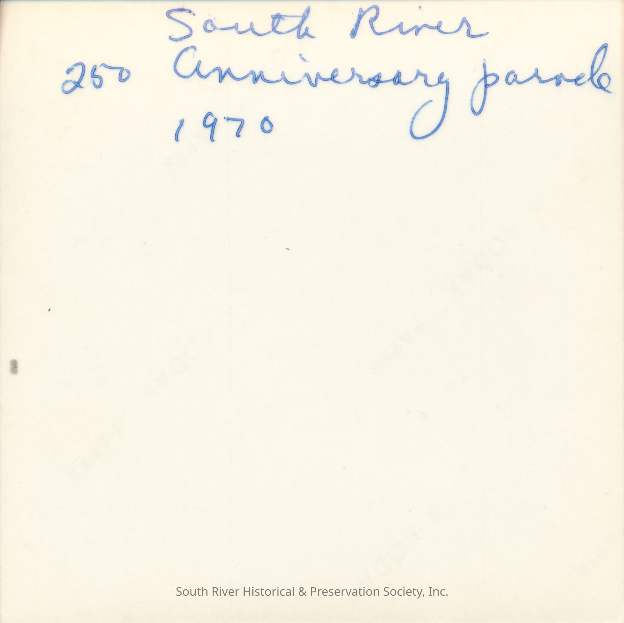 The back of the photo has a note handwritten in blue ink that reads, "South River, 250 Anniversary Parade, 1970."