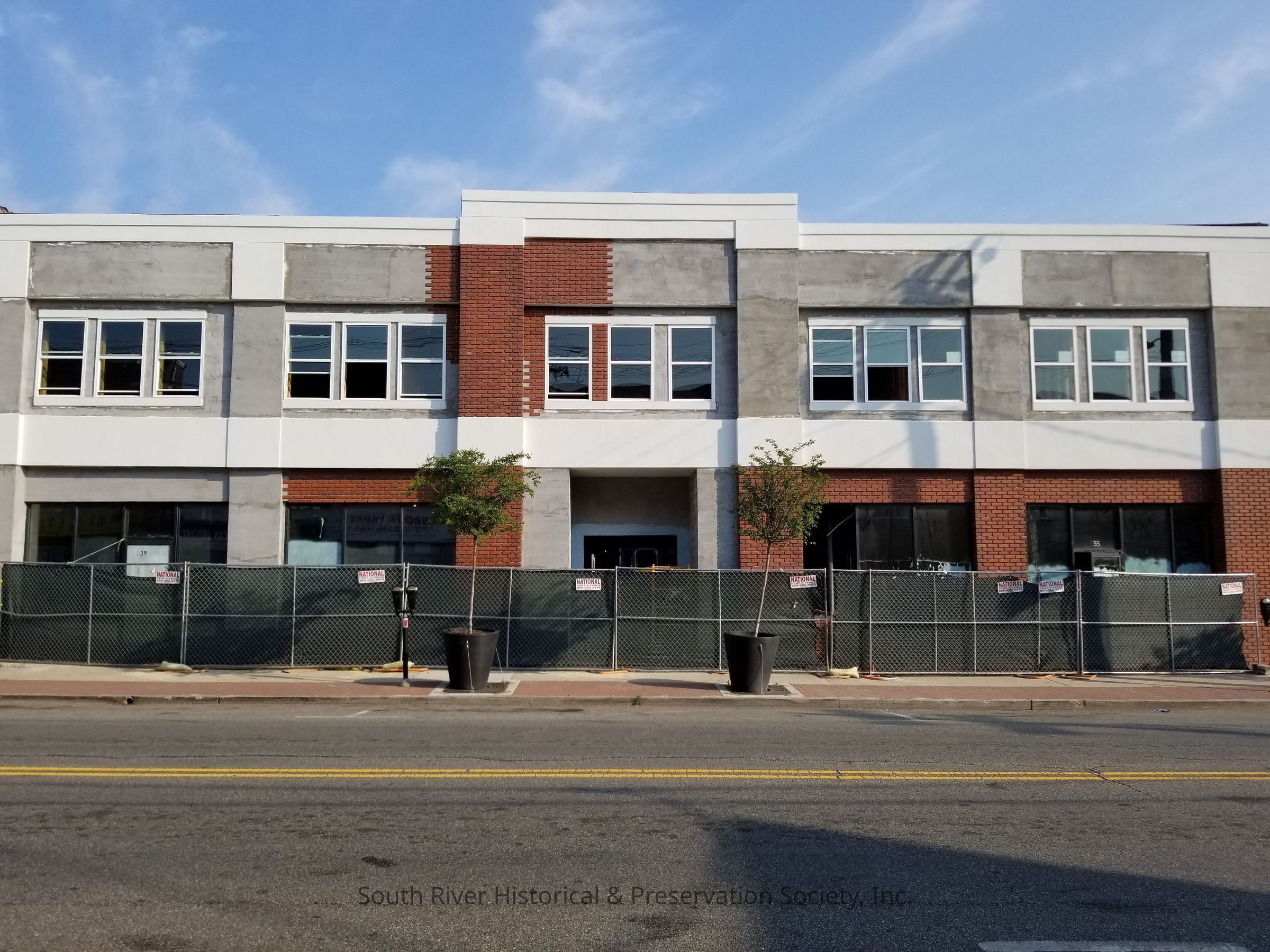 Digital color photograph of the Capitol Building under construction. The new windows are in place and the facade has been partially completed. The view is from the opposite side of Main Street.