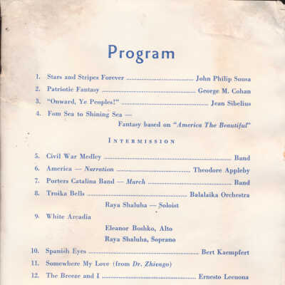 Text on the back of the cover lists members of The Imperial Band, The Imperial Chorus, and the South River Russian Balalaika Orchestra. Program lists musical pieces to be performed along with composers or arrangers as well as key people in the program: