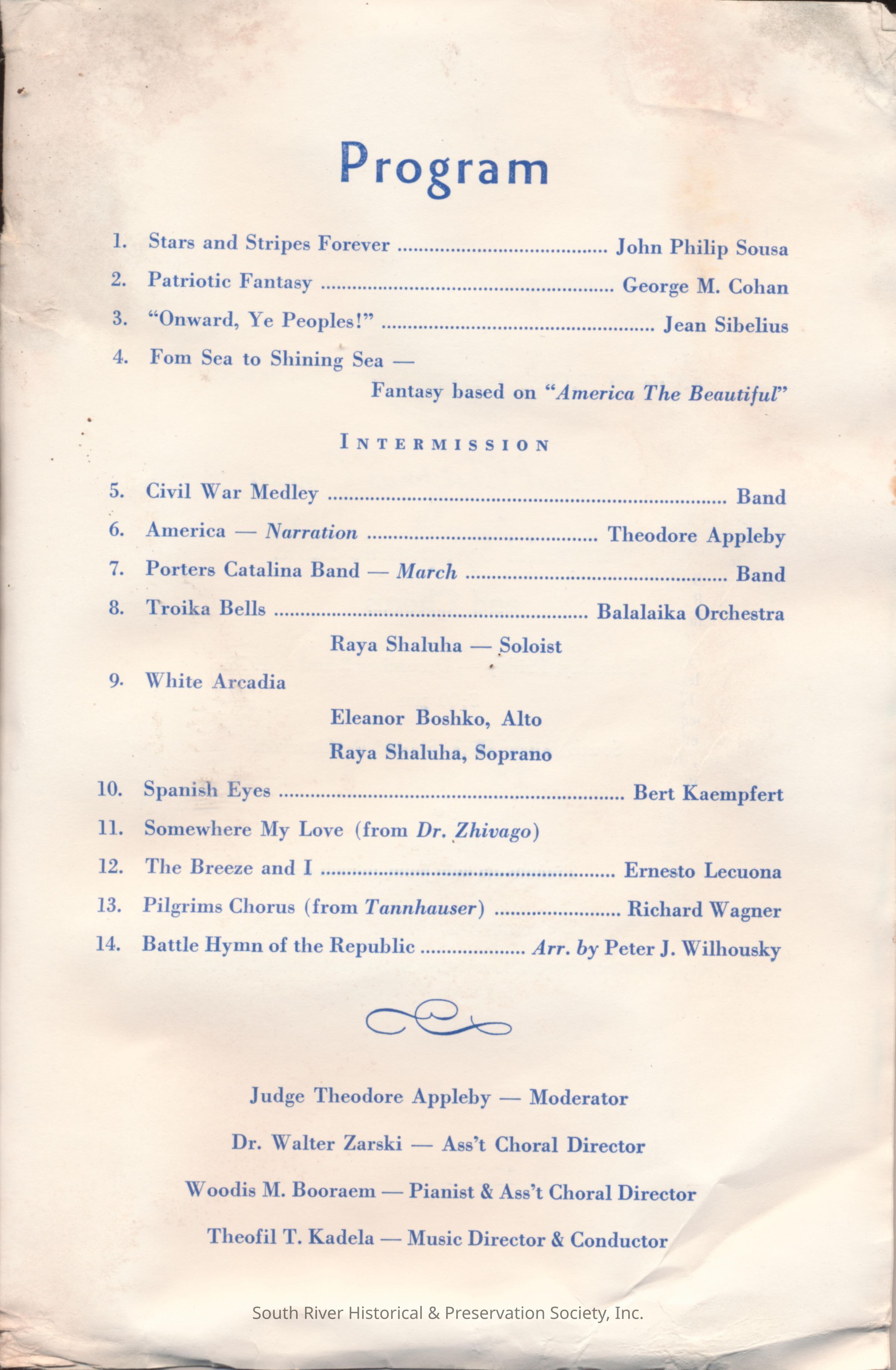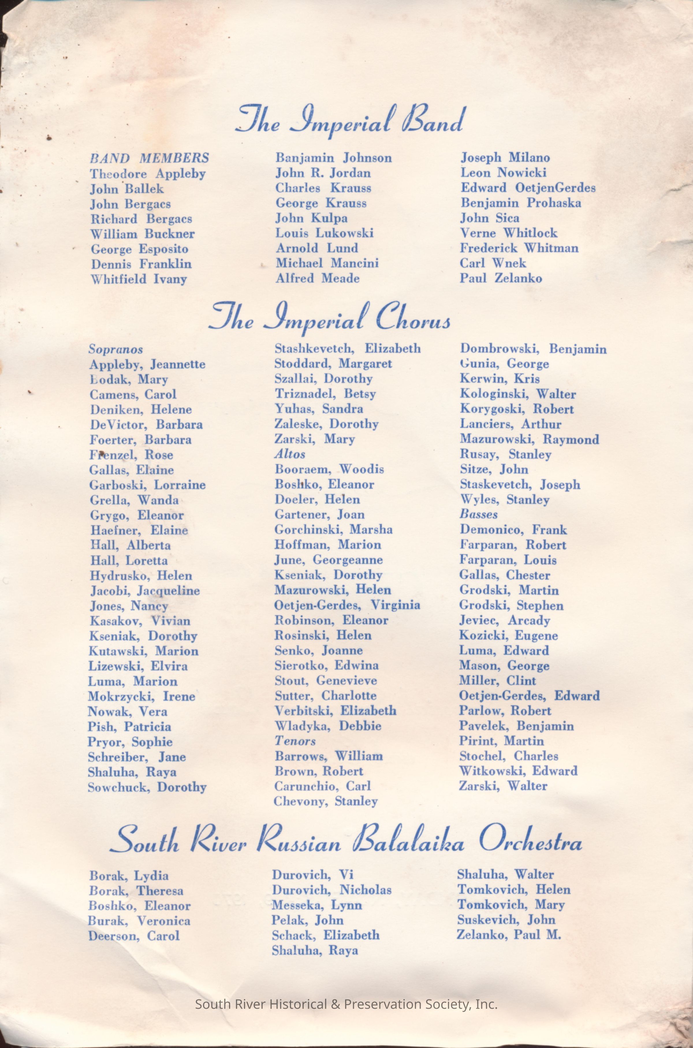 Appleby, Theodore, Zarski, Walter (Dr.), Booraem, Woodis M., Kadela, Theofil T., Imperial Band, Imperial Chorus, South River Russian Balalaika Orchestra