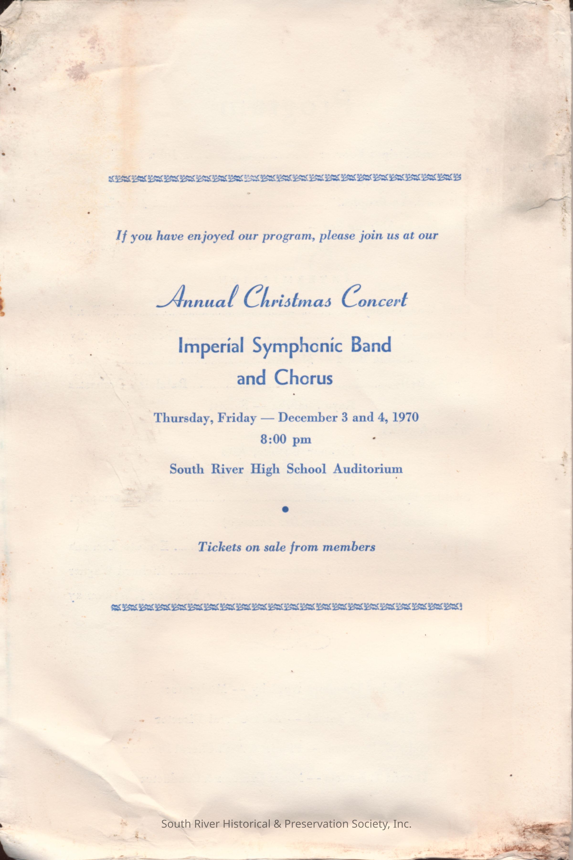 Program for the Imperial Symphonic Band and Chorus concert in celebration of the 250th anniversary of South River. The seal of South River appears on the front cover along with text reading: "Borough of South River, New Jersey; 1720 - 1970; 250th Anniversary -- Concert by the Imperial Symphonic Band and Chorus, Monday, November 9, 1970."
