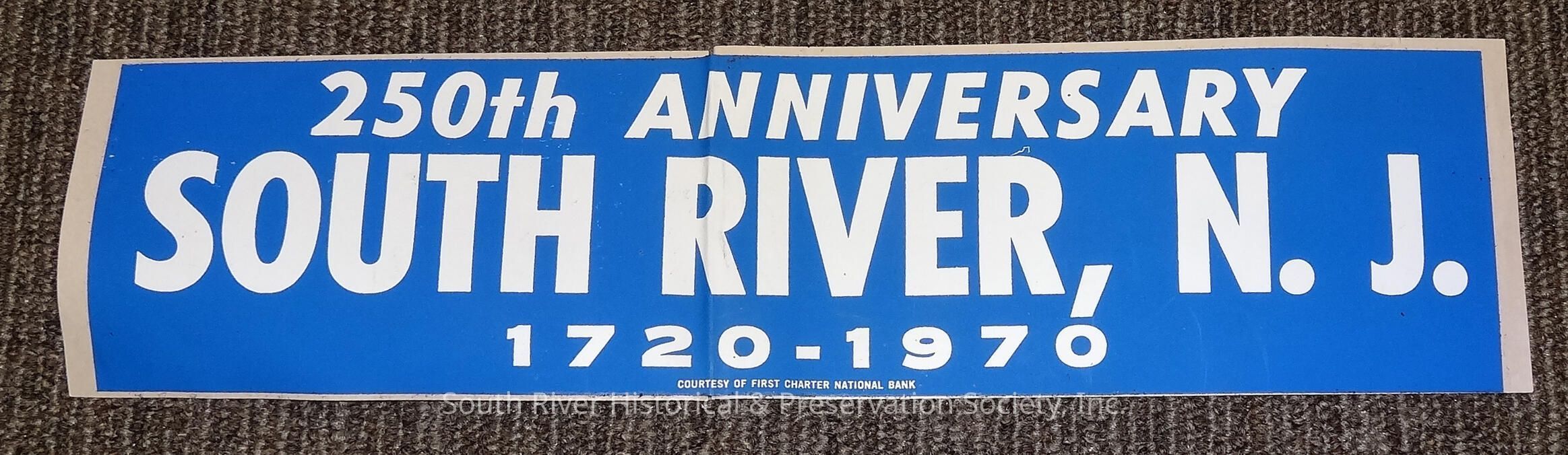 Bumper sticker printed for the 250th anniversary of South River in 1970. Bumper sticker is blue with white text reading: "250th Anniversary/South River, N.J., 1720-1970, Courtesy Of First Charter National Bank".