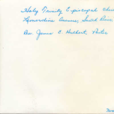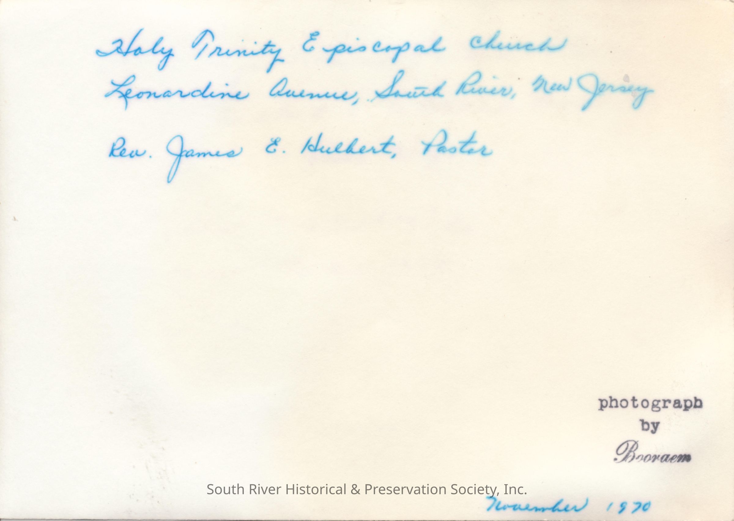 A note handwritten on the back in blue ink reads "Holy Trinity Episcopal Church, Leonardine Avenue, South River, New Jersey; Rev. James E. Hulbert, Pastor; November 1970."