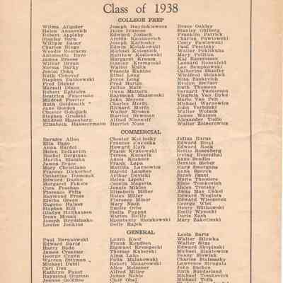 The inside of the leaflet includes a "Program" schedule, a list of "Members of National Honor Society," a list of members of the "Honor Group," and a list of the members of the "Board of Education." The back cover provides a list of graduates in the "Class of 1938" divided into categories by overall discipline: College Prep, Commercial, General, Home Economics, and Industrial Arts.