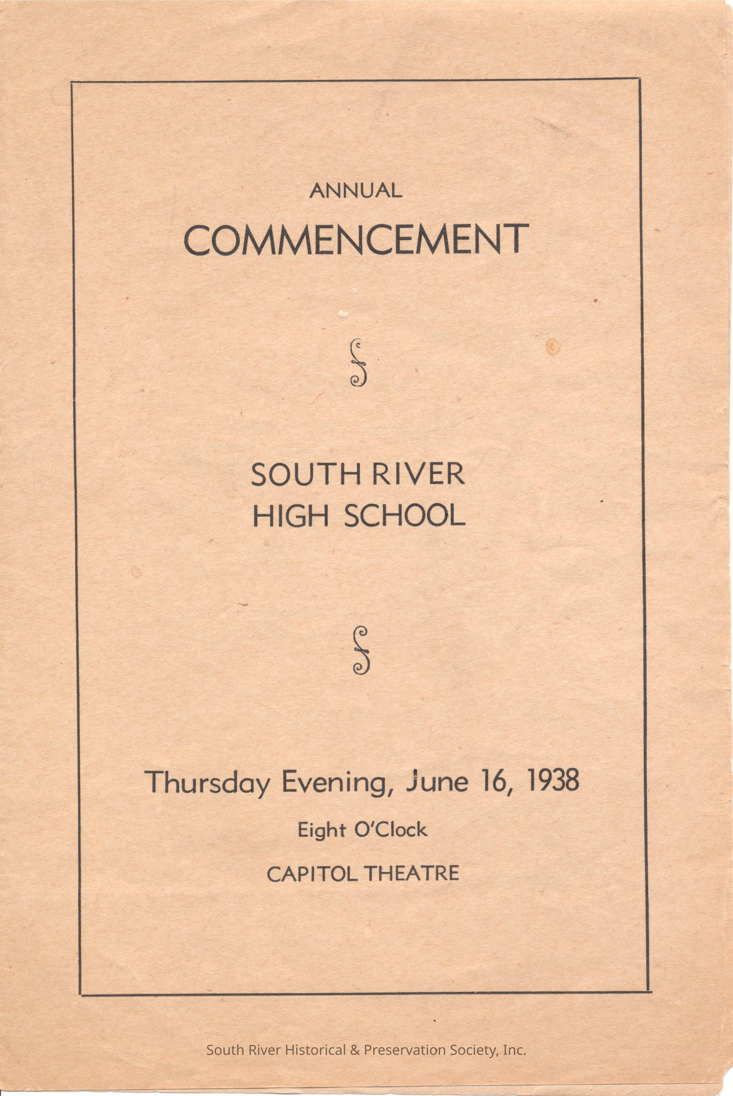 Commencement program with text on the front cover that reads, "Annual Commencement, South River High School, Thursday Evening, June 16, 1938, Eight O'Clock, Capitol Theatre."