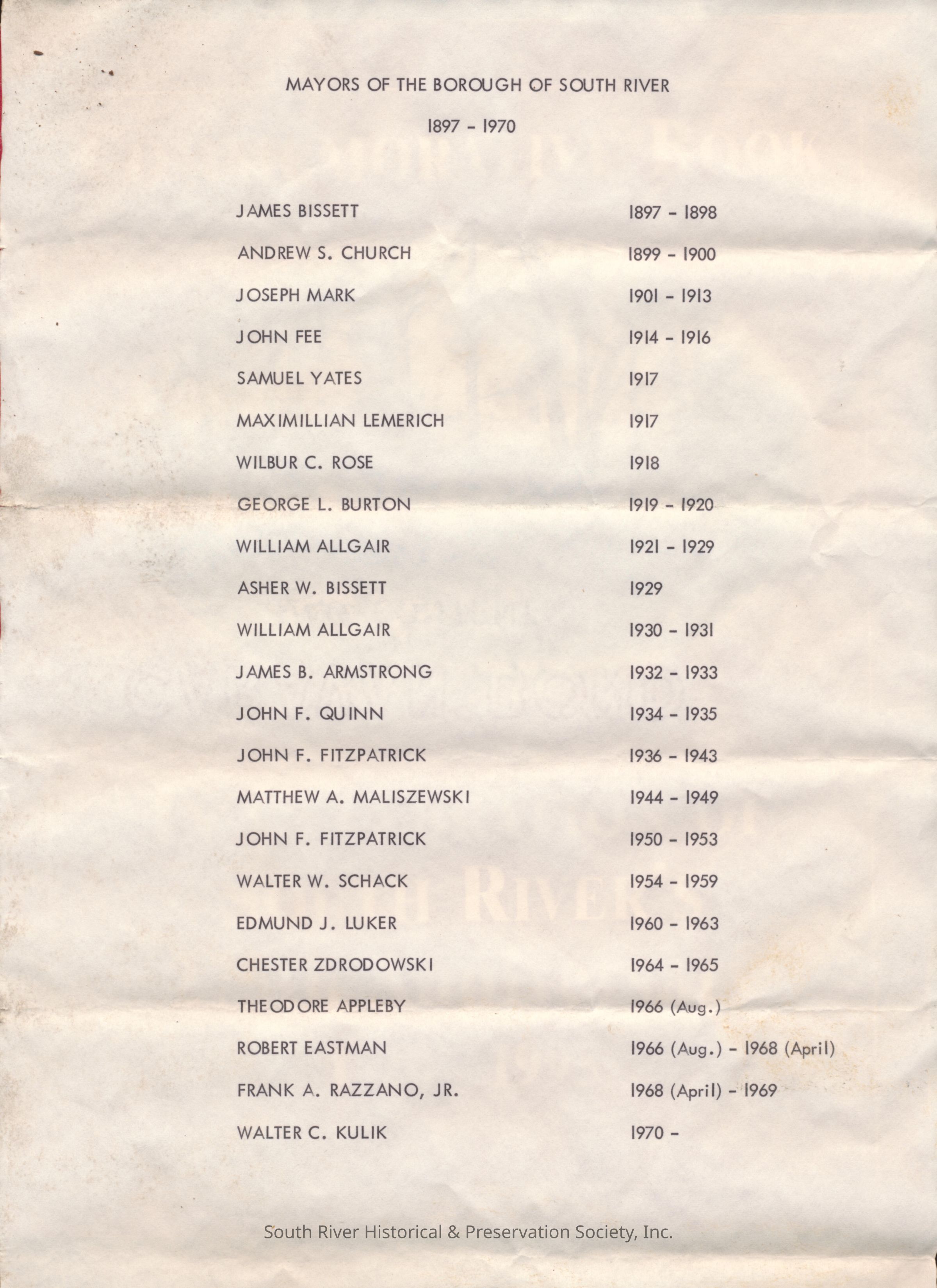 Roster of South River mayors from 1897 to 1970. The text is printed in black ink and reads as follows.