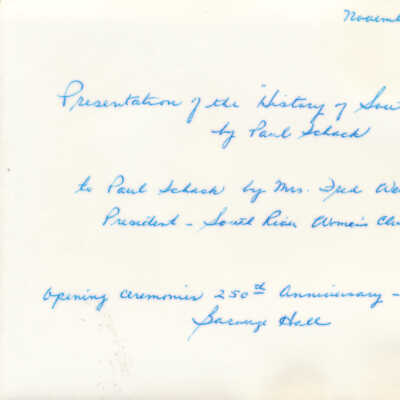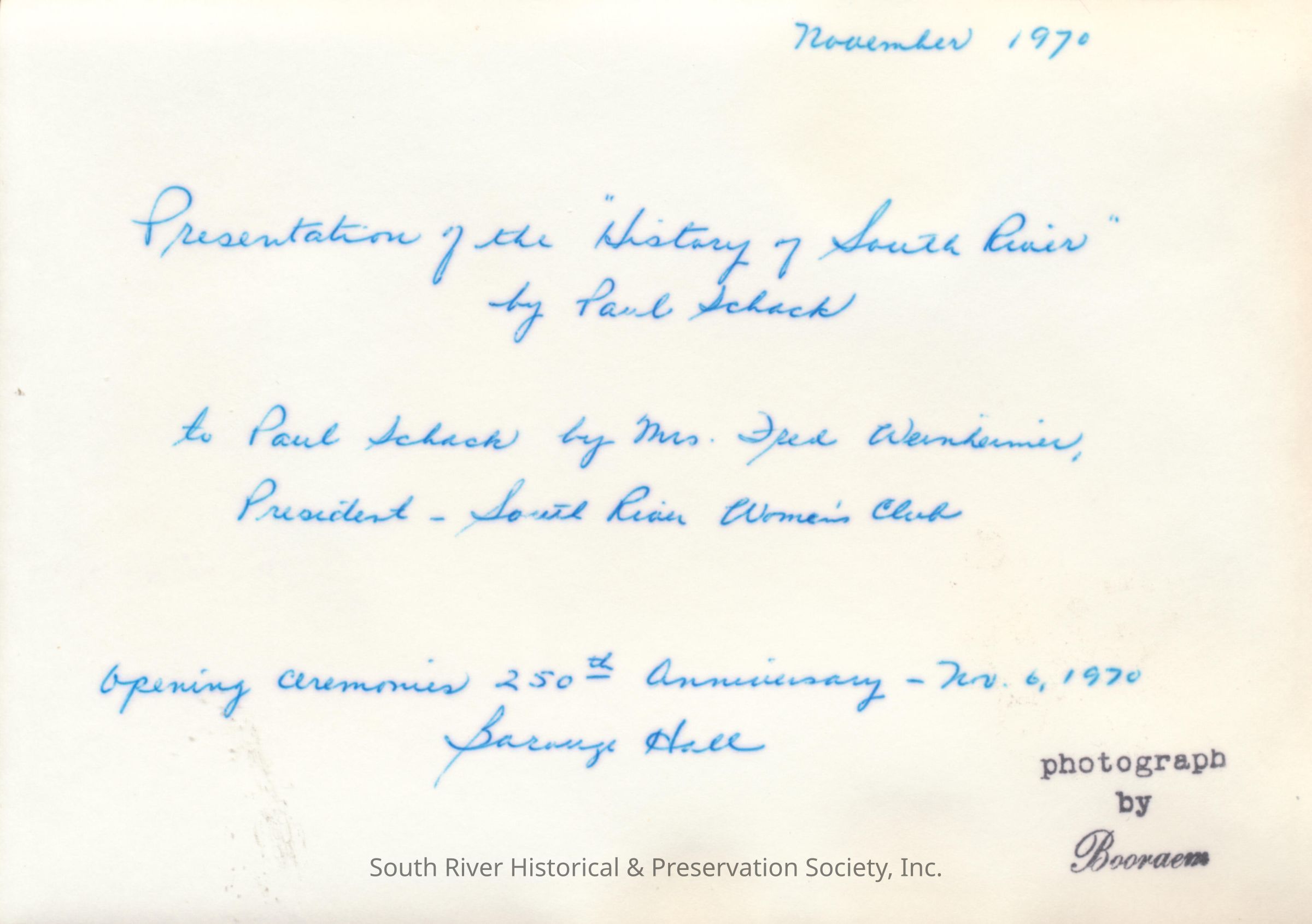 A note handwritten on the back in blue ink reads "November 1970; Presentation of the "History of South River," by Paul Schack; to Paul Schack by Mrs. Fred Weinheimer, President - South River Woman's Club; opening ceremonies 250th Anniversary - Nov. 6, 1970, Borough Hall."