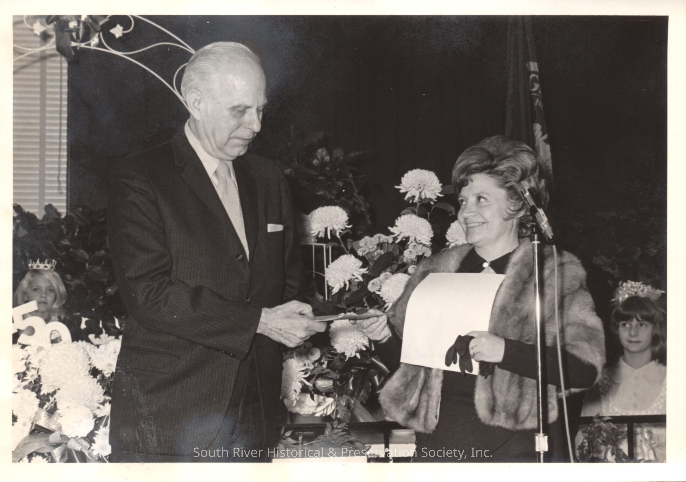 Photograph of Paul A. Schack accepting a copy of his "History of South River" from Joyce Weinheimer, President of the South River Woman's Club, during the opening event held in the Council chambers in the Borough Hall on November 6, 1970 for the celebration of South River's 250th anniversary. Taryn Thomas is visible in the background at the left. The identity of the girl at the right is unknown.
