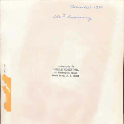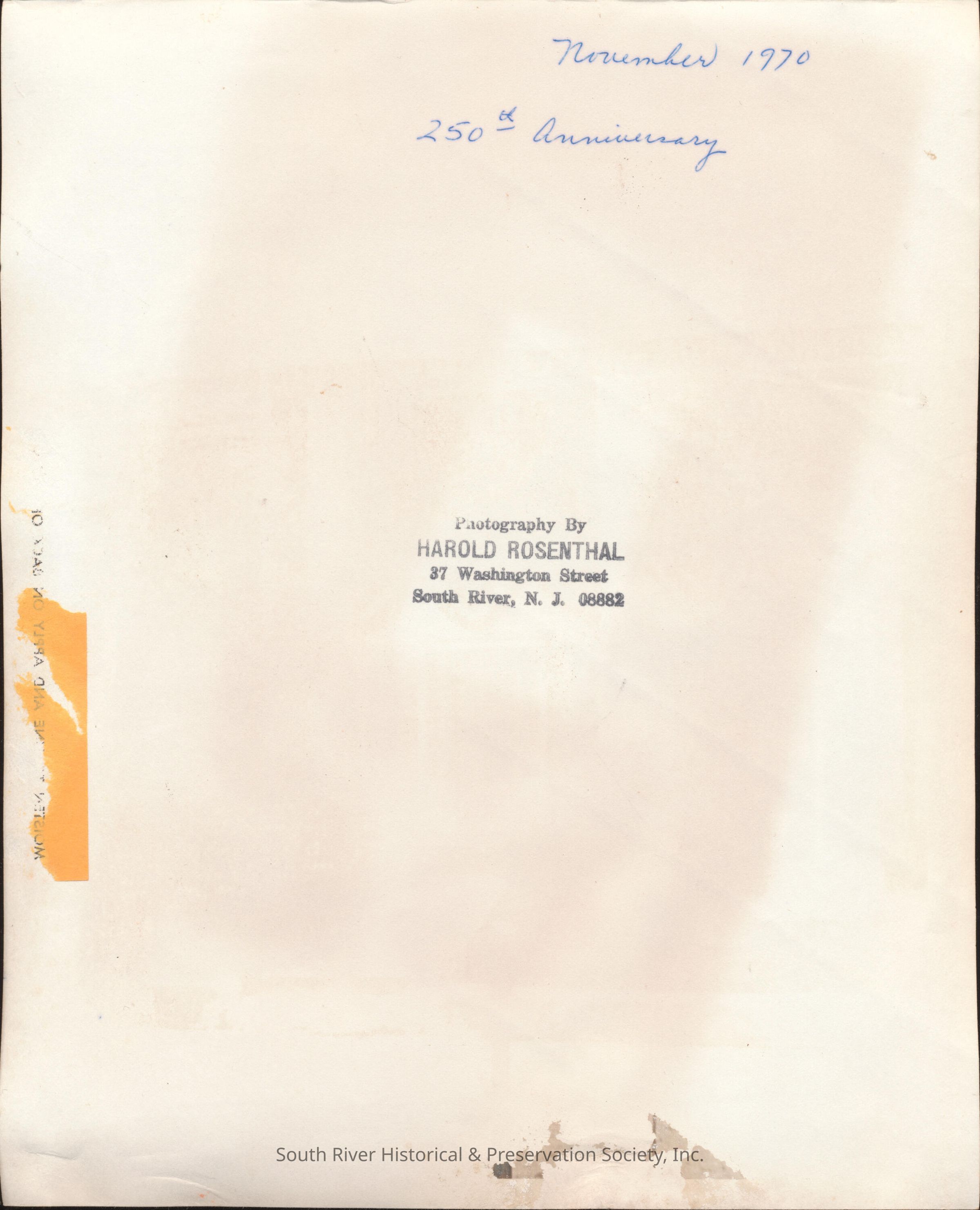 "Photography by Harold Rosenthal, 37 Washington Street, South River, NJ 08882" is stamped on the back in black ink. The left edge has the remains of a sticker with mirror-imaged text reading " Moisten ???ne and apply on back of ???"