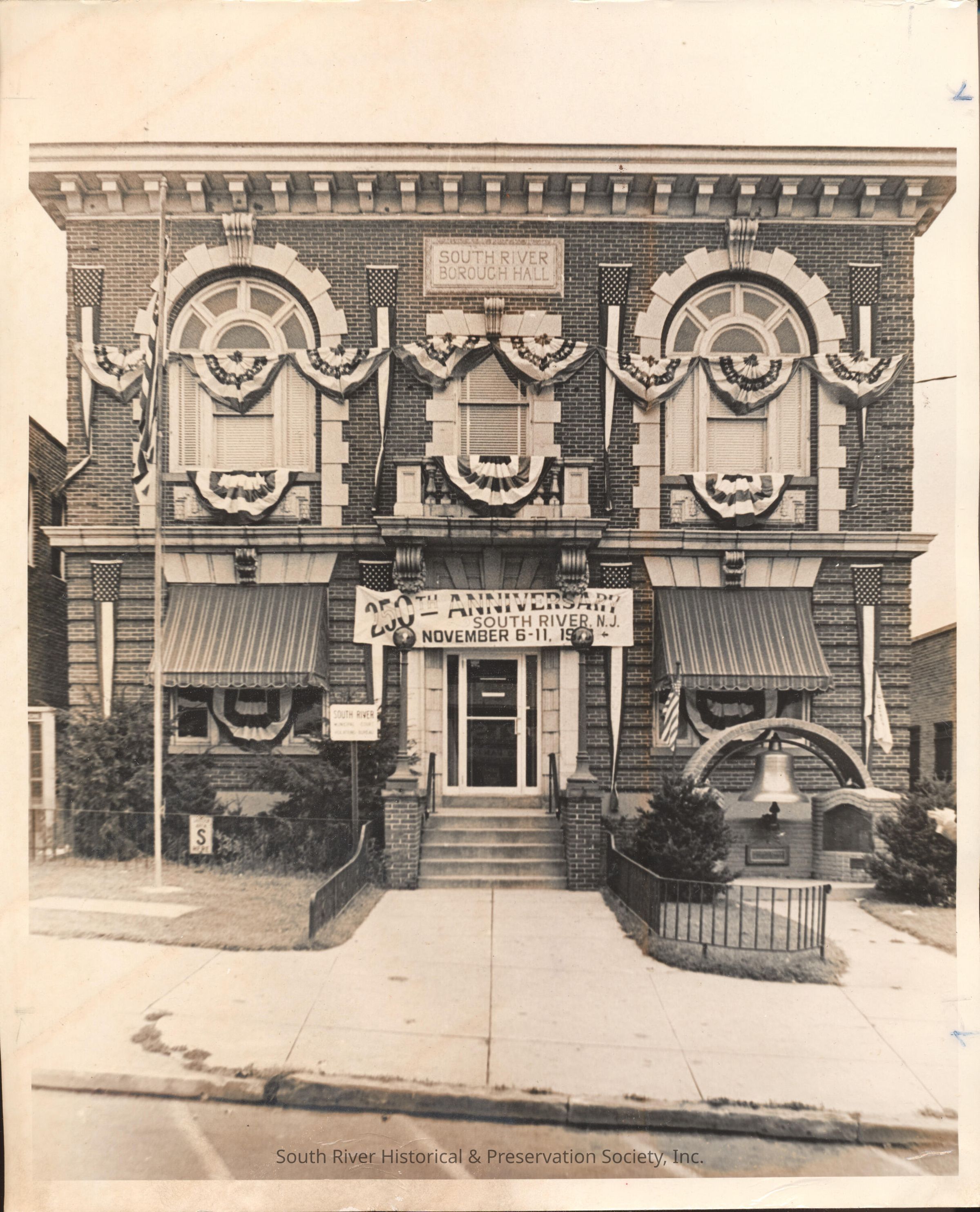 Photograph of the South River Borough Hall decorated for the celebration of South River's 250th anniversary in 1970. Bunting is stretched across the windows and a banner reading "250th Anniversary, South River,, N.J., November 6-11, 1970" is suspended over the door.