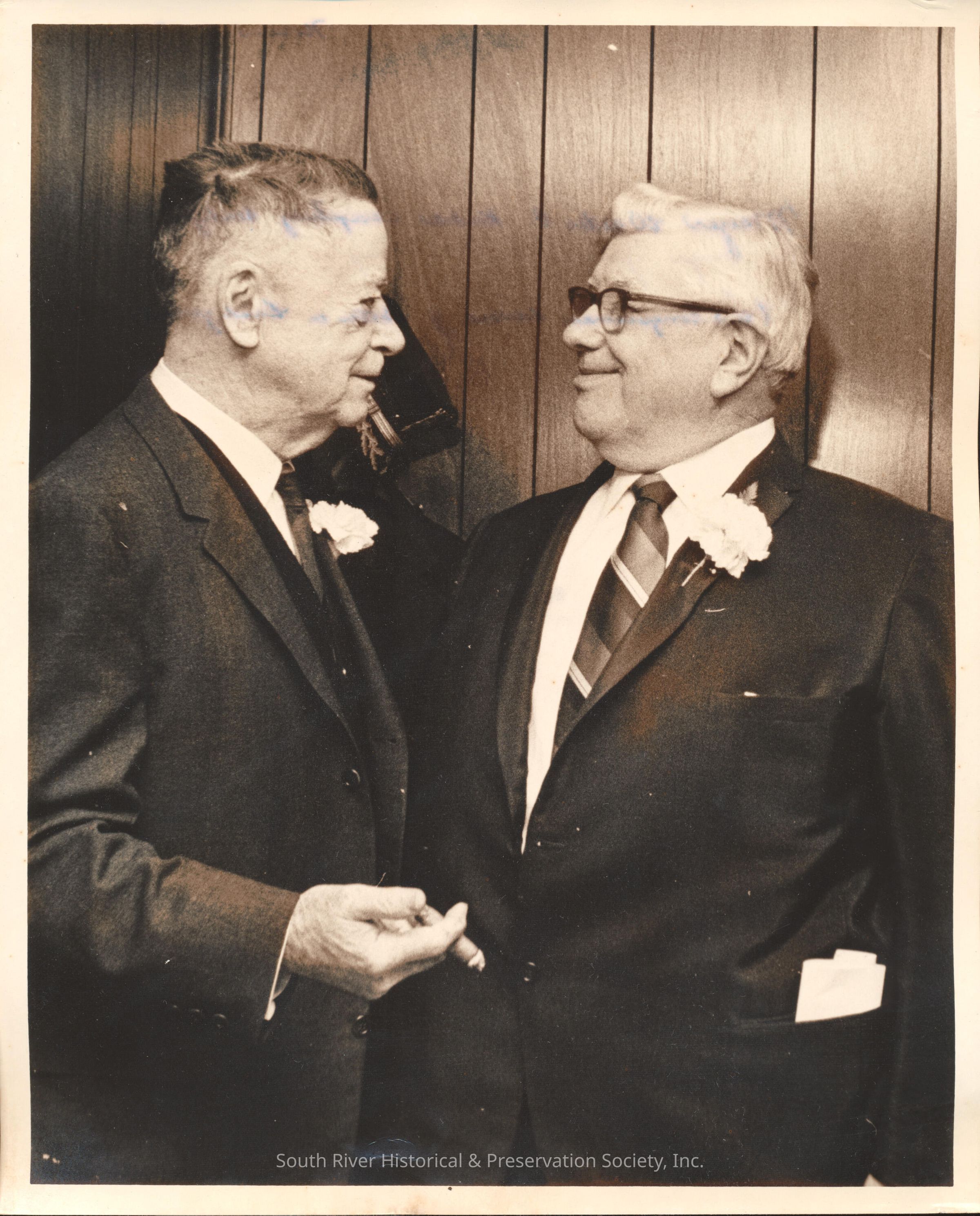 Photograph of Former Mayor James B. Armstrong (left) with Congressman Edward J. Patten. Both men are wearing carnations and Armstrong is holding a lit cigar. The photograph was taken at the opening ceremony for the celebration of South River's 250th anniversary. The event was held in the Council chambers in the Borough Hall on November 6, 1970.