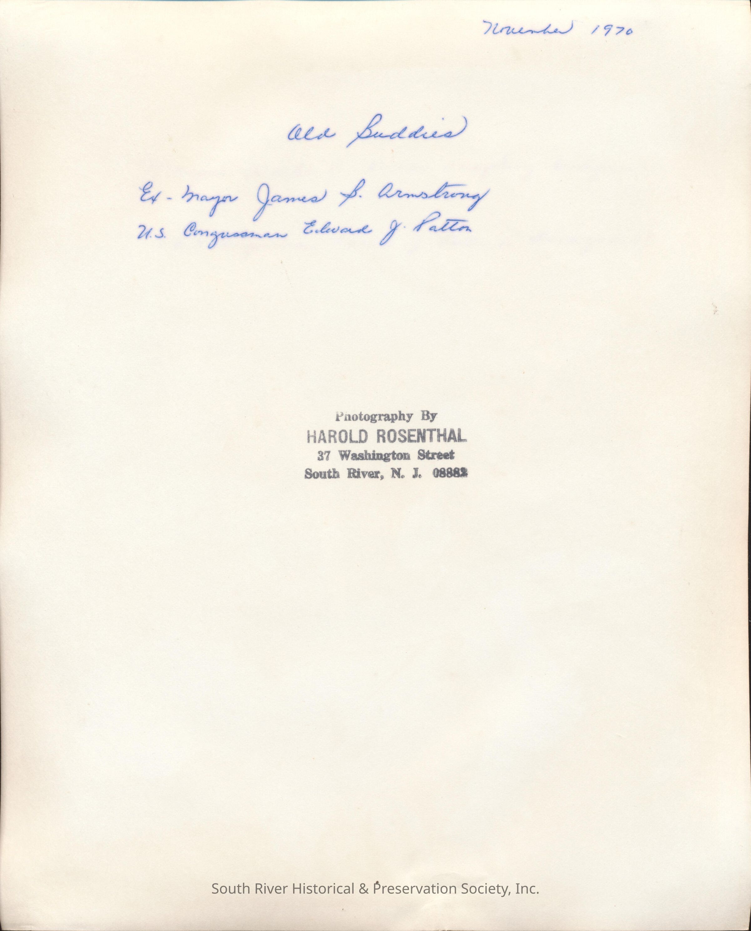 A note handwritten on the back in blue ink reads " November 1970, Old Buddies, Ex-Mayor James B. Armstrong, U.S. Congressman Edward J. Patten."