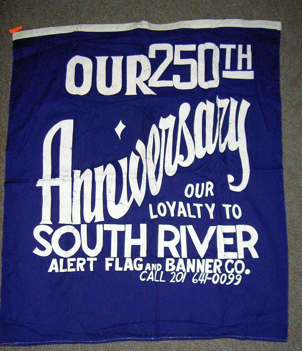 Blue cotton banner with white binding along the top. White print on a blue field reads "Our 250th Anniversary, our loyalty to South River, Alert Flag and Banner Co., Call 201-641-0099"