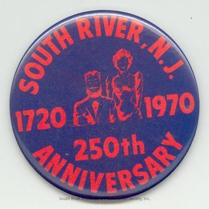 Metal and plastic button with a pin back. Button is blue with red printing that reads, "South River, N.J., 1720-1970, 250th Anniversary." The center of the design includes outlines of a man and a woman in historical dress.