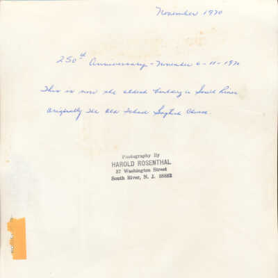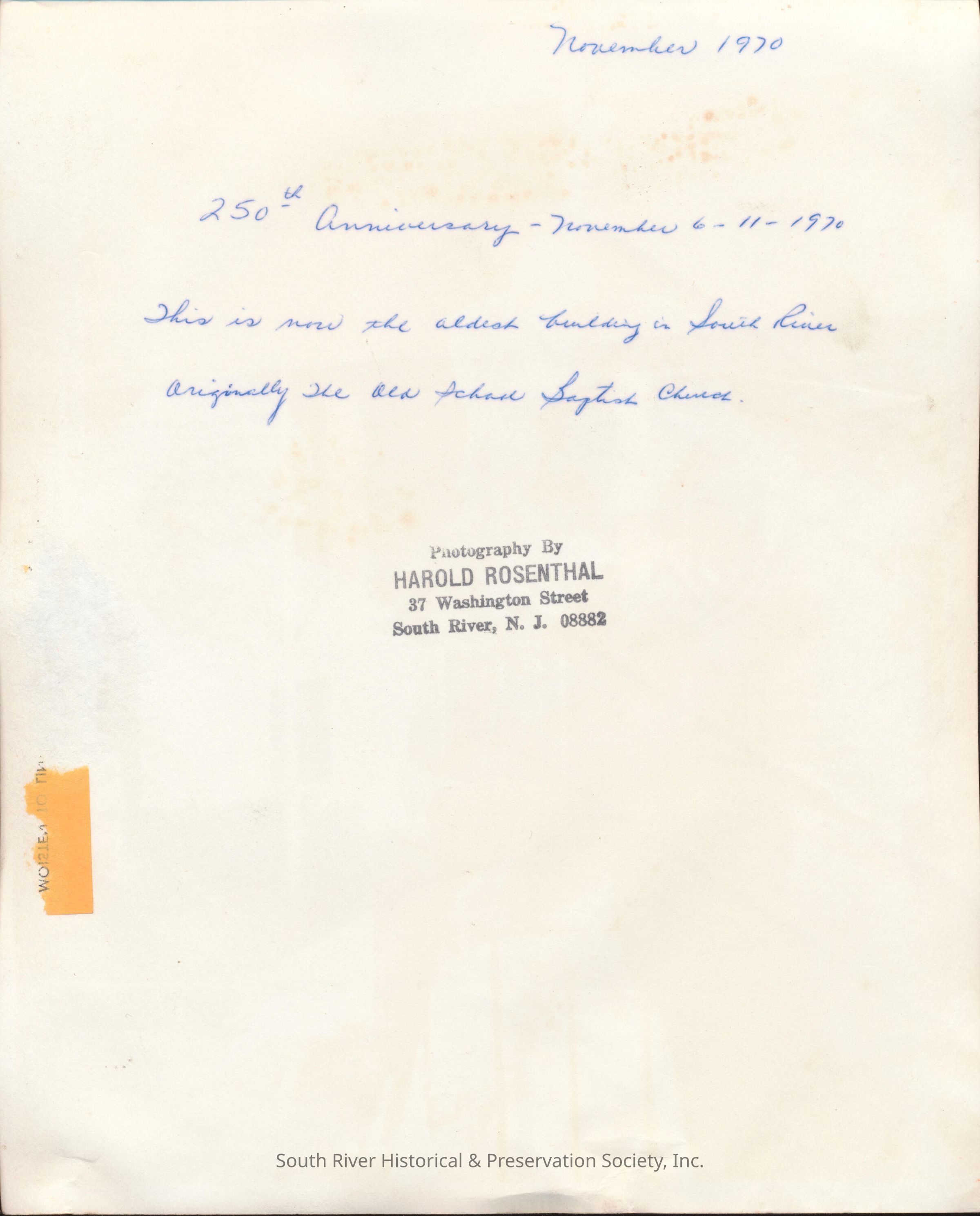 A note handwritten on the back in blue ink reads " November 1970, 250th Anniversary - November 6 - 11, 1970. This is now the oldest building in South River, originally the Old School Baptist Church."