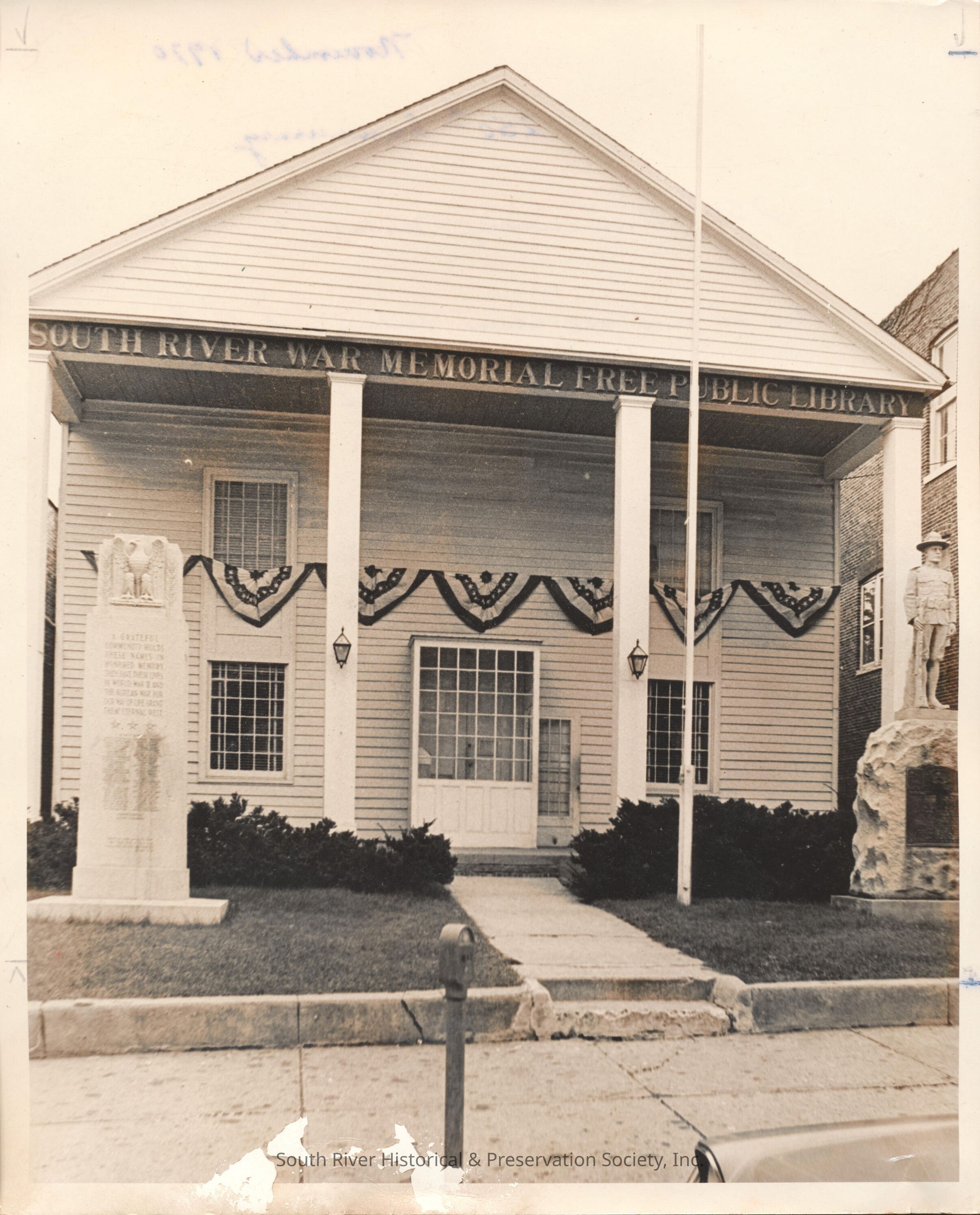 Photograph of the South River Public Library decorated with bunting for the celebration of South River's 250th anniversary in 1970. Both the World War I doughboy memorial and the World War II and Korean Conflict memorial are visible on the lawn in front of the building. The sign on the building reads "South River War Memorial Free Public Library."
