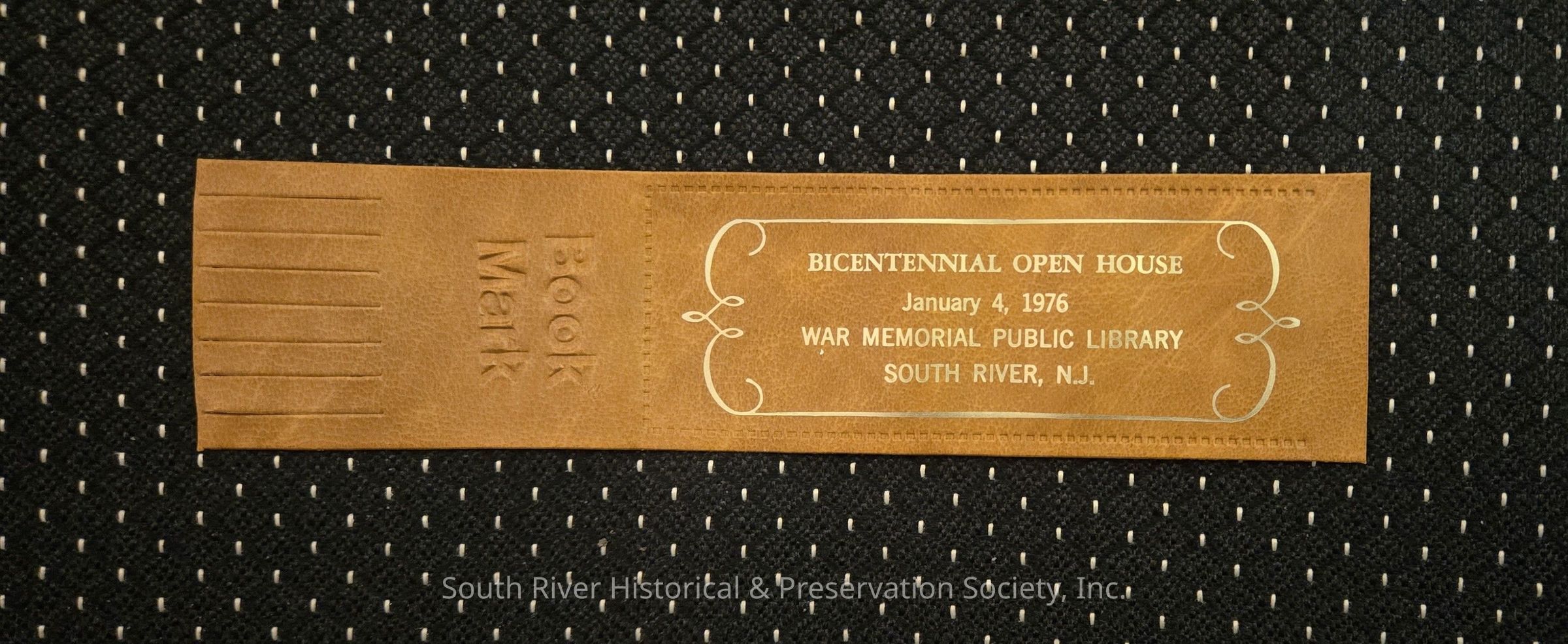 Leatherette bookmark with gold stamped text that reads, "Bicentennial Open House, January 4, 1976; War Memorial Public Library, South River N.J." The words "Book Mark" are imprinted toward the bottom of the item and the bottom edge is fringed.