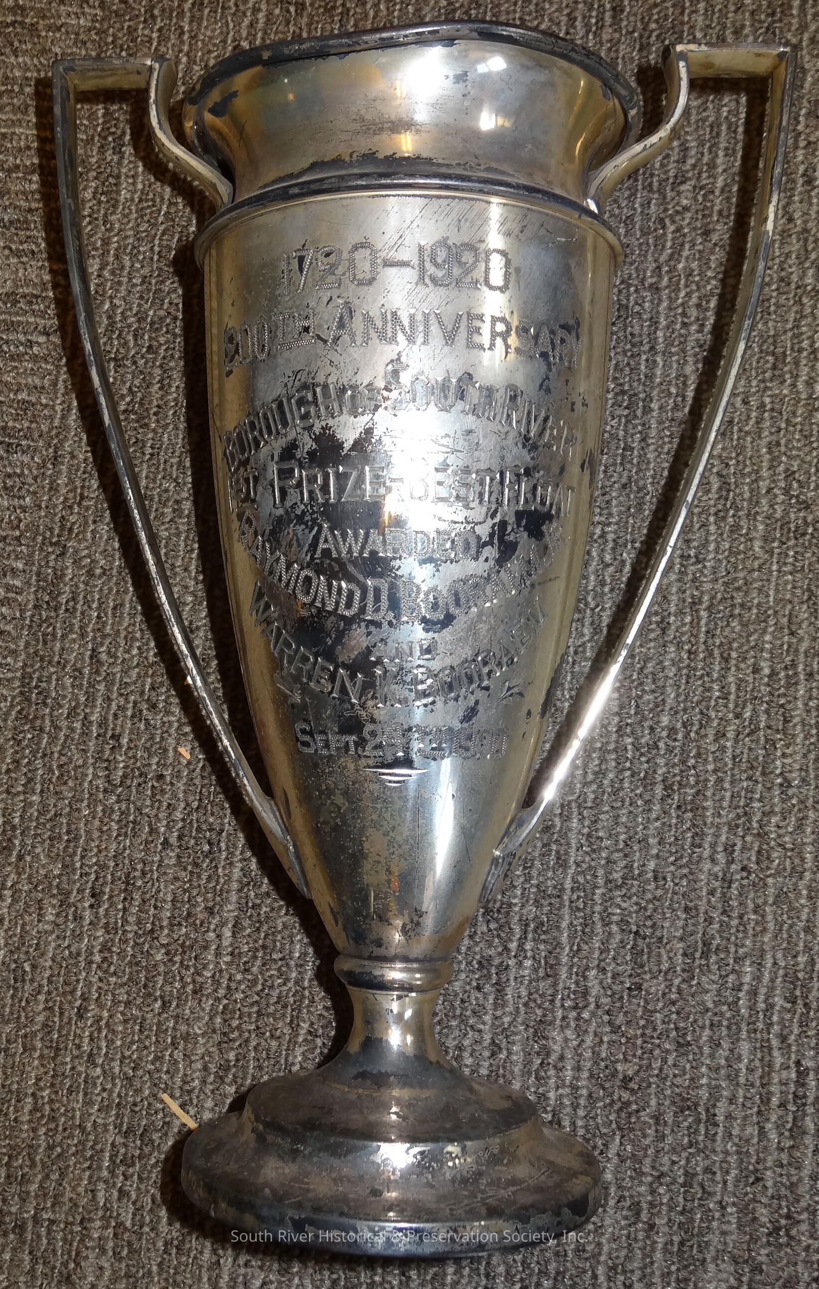 Silver plated trophy. Text on the front of the trophy reads: "1720-1920, 200th Anniversary, Borough of South River, 1st Prize Best Float, Awarded Raymond D. Booraem Jr. and Warren K. Booraem, Sept. 24th 1920".