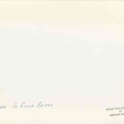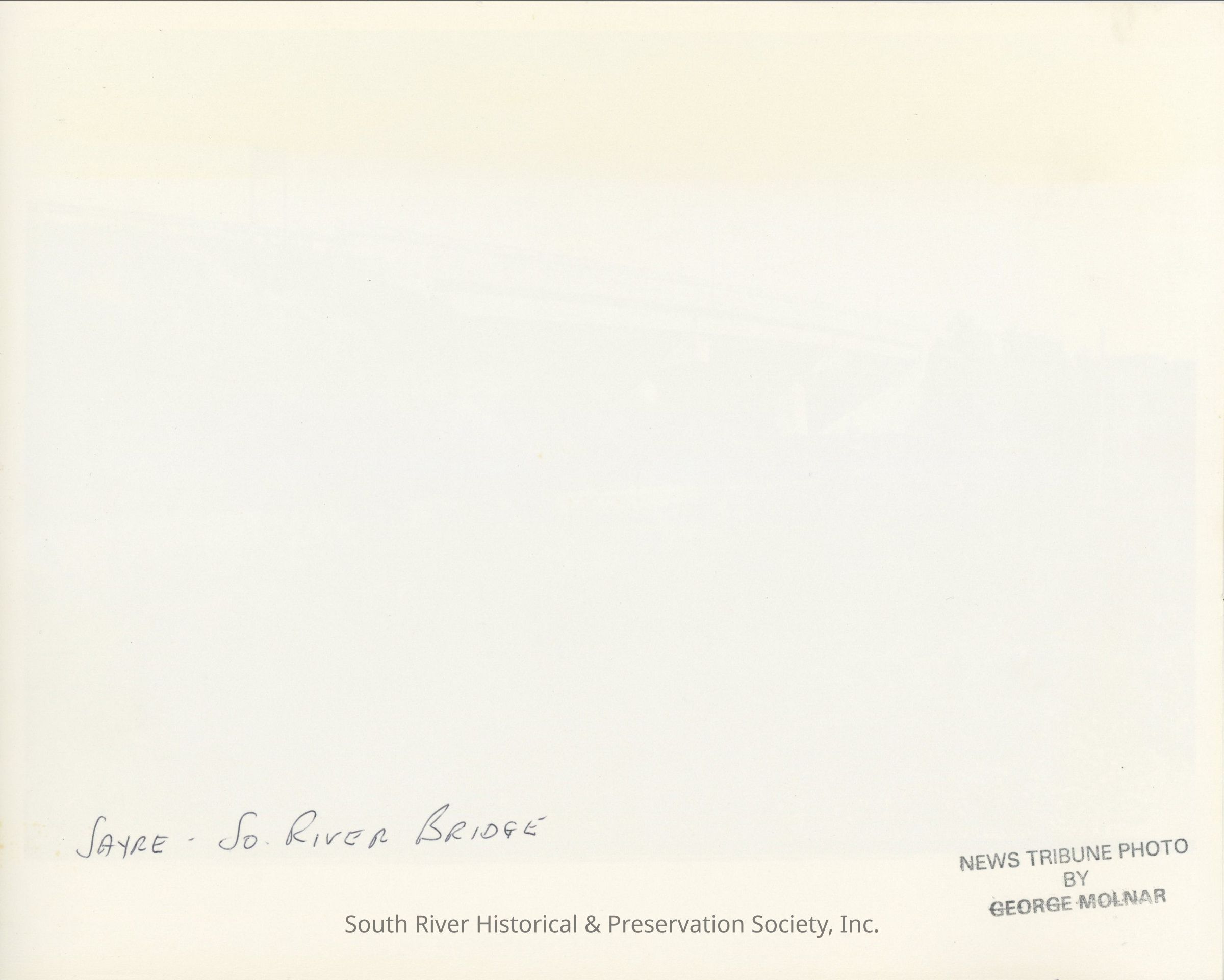 The back of the photograph has a handwritten note that reads, "Sayre - So. River Bridge." "News Tribune Photo by George Molnar" is also stamped on the back.