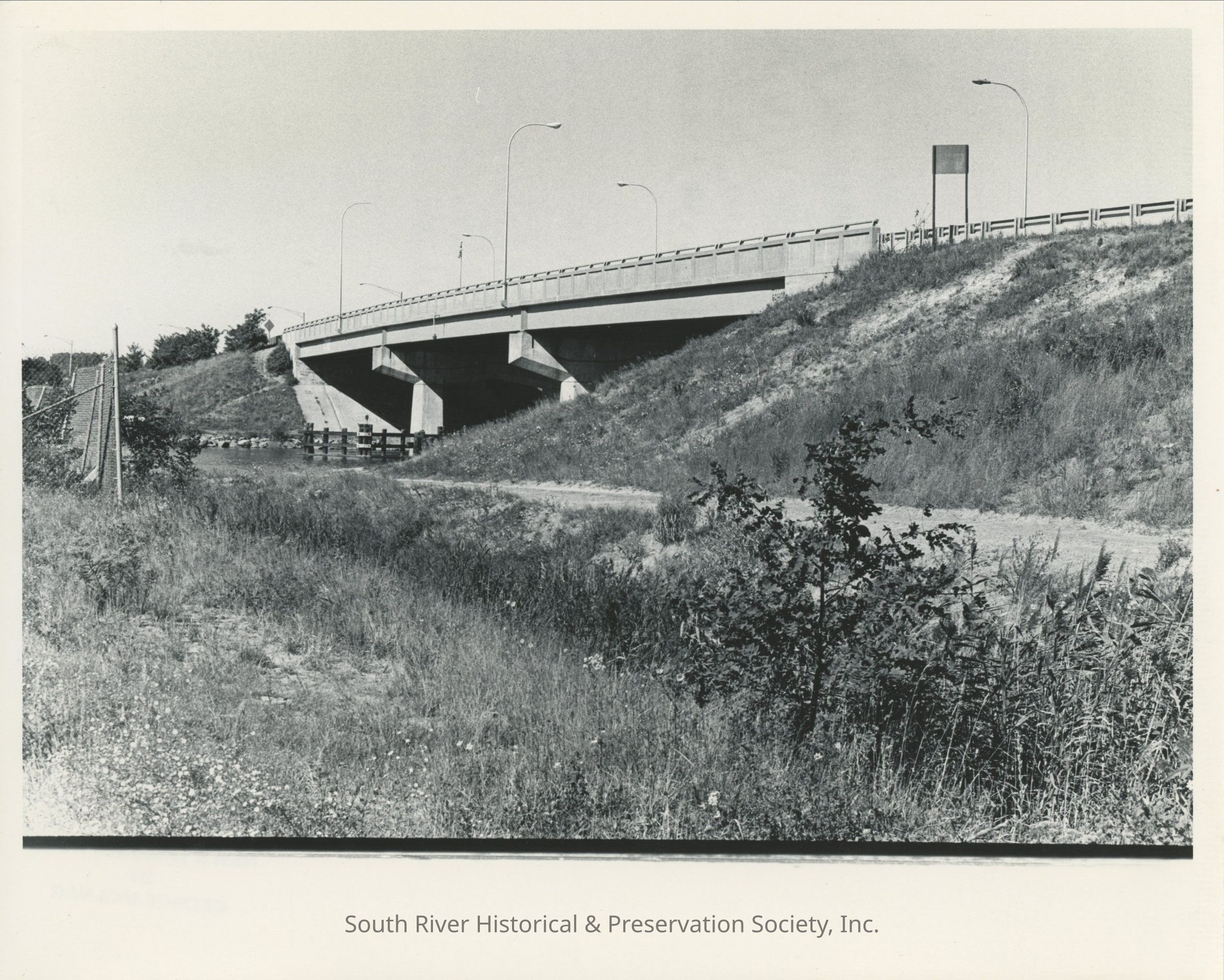 Black and white photograph of a side view of the new bridge around the date of its opening on July 24, 1974.