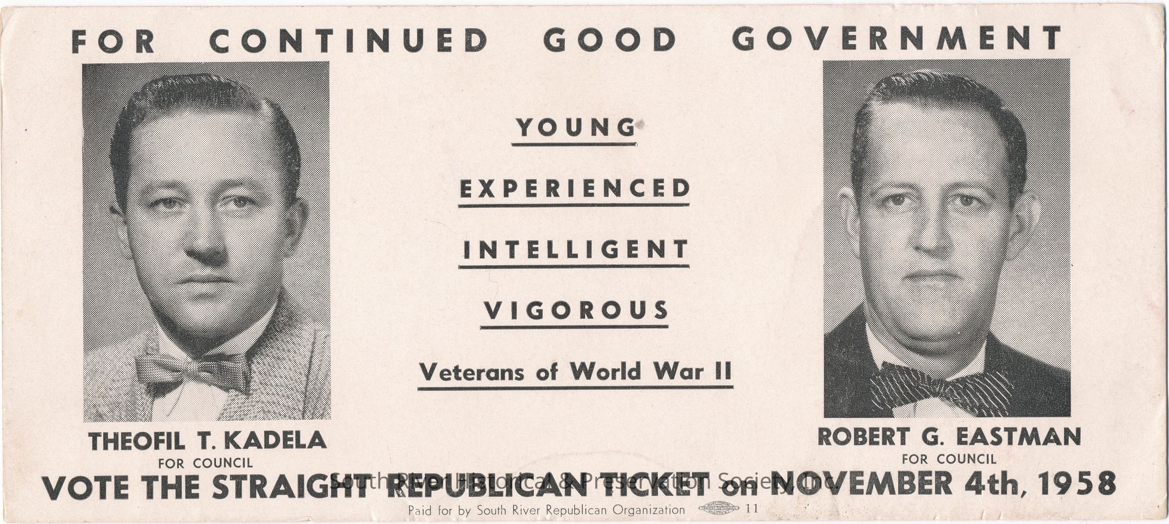 Ink blotter promoting Republican incumbents Theofil T. Kadela and Robert G. Eastman in the 1958 borough council election. Photograph on the left side of the blotter shows Kadela and the one on the right side shows Eastman. Text on the blotter reads: "For Continued Good Government; Young, Experienced, Intelligent, Vigorous, Veterans of World War II; Theofil T. Kadela for Council, Robert G. Eastman for Council; Vote The Straight Republican Ticket on November 4th 1958; Paid for by South River Republican Organization." Back is pink blotting paper with three small dots of blue ink at the bottom right.