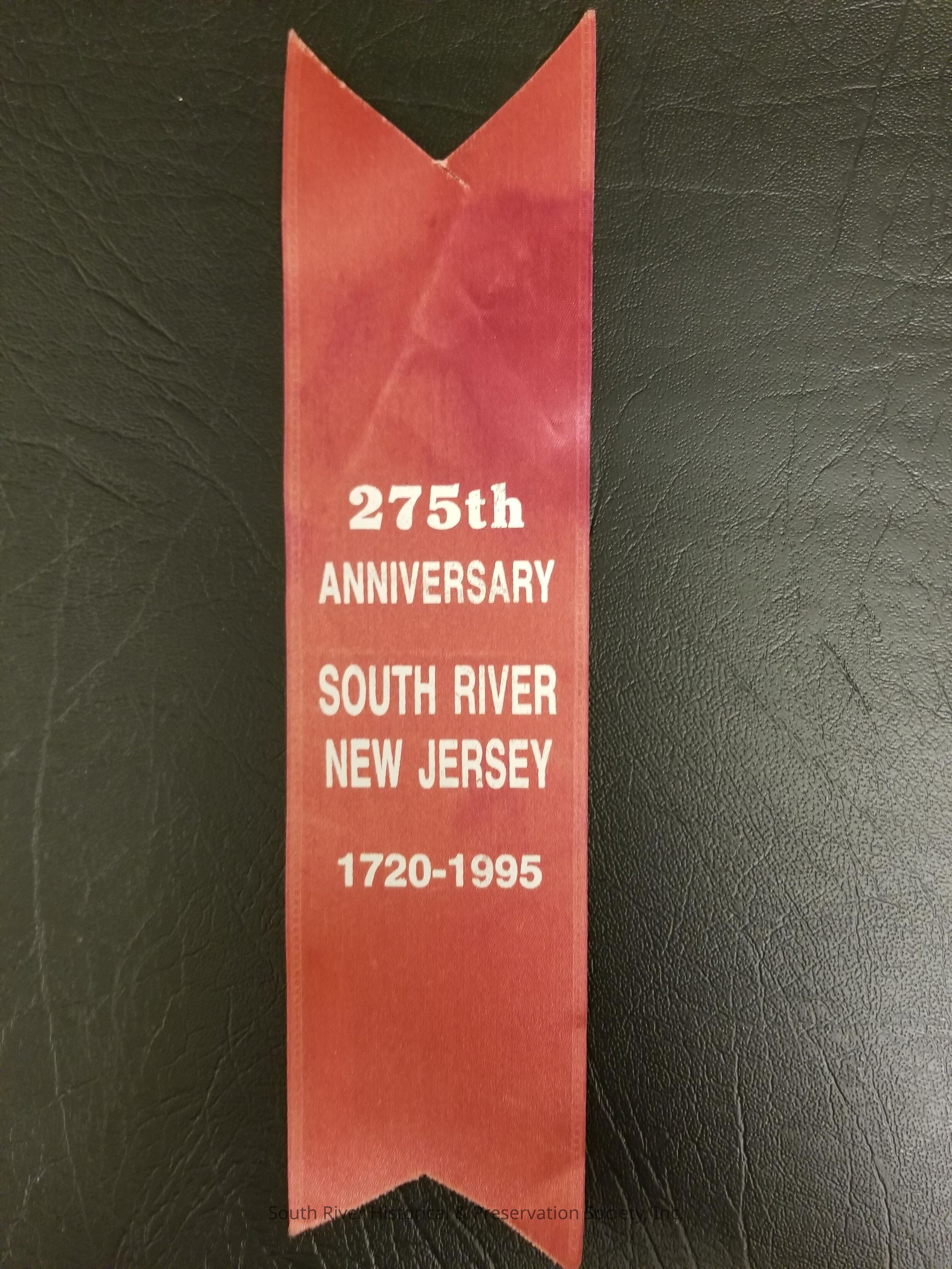 Red ribbon with an uneven two-pointed edge on both top and bottom. White printed text on the front center commemorates "275th Anniversary -- South River, New Jersey -- 1720-1995".