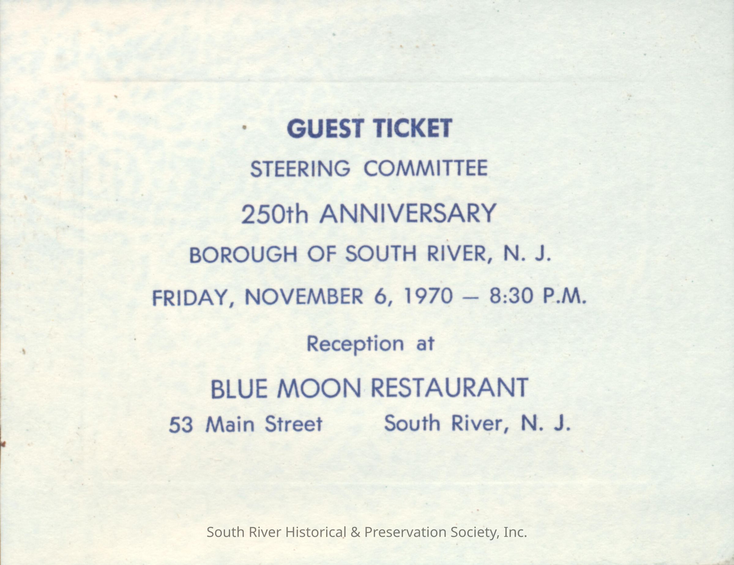 Ticket for South River's 250th Anniversary Steering Committee reception dinner held on November 6, 1970 at the Blue Moon Restaurant. The ticket has an embossed border and text printed in blue ink reading: "Guest Ticket, Steering Committee, 250th Anniversary, Borough of South River, N.J.; Friday, November 6, 1970 - 8:30 P.M. Reception at Blue Moon Restaurant, 53 Main Street South River, N.J."