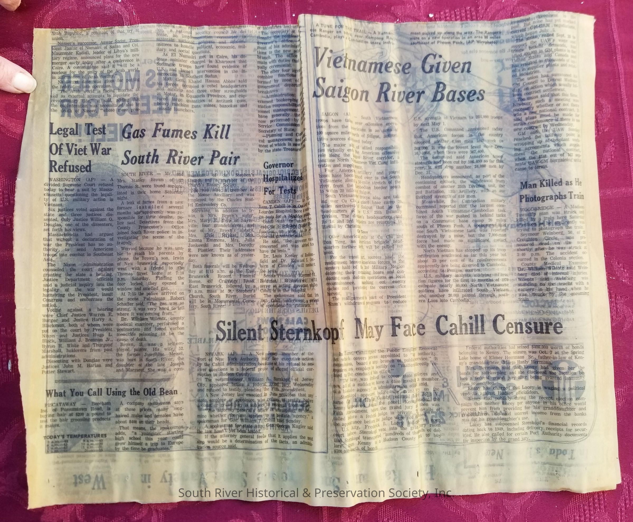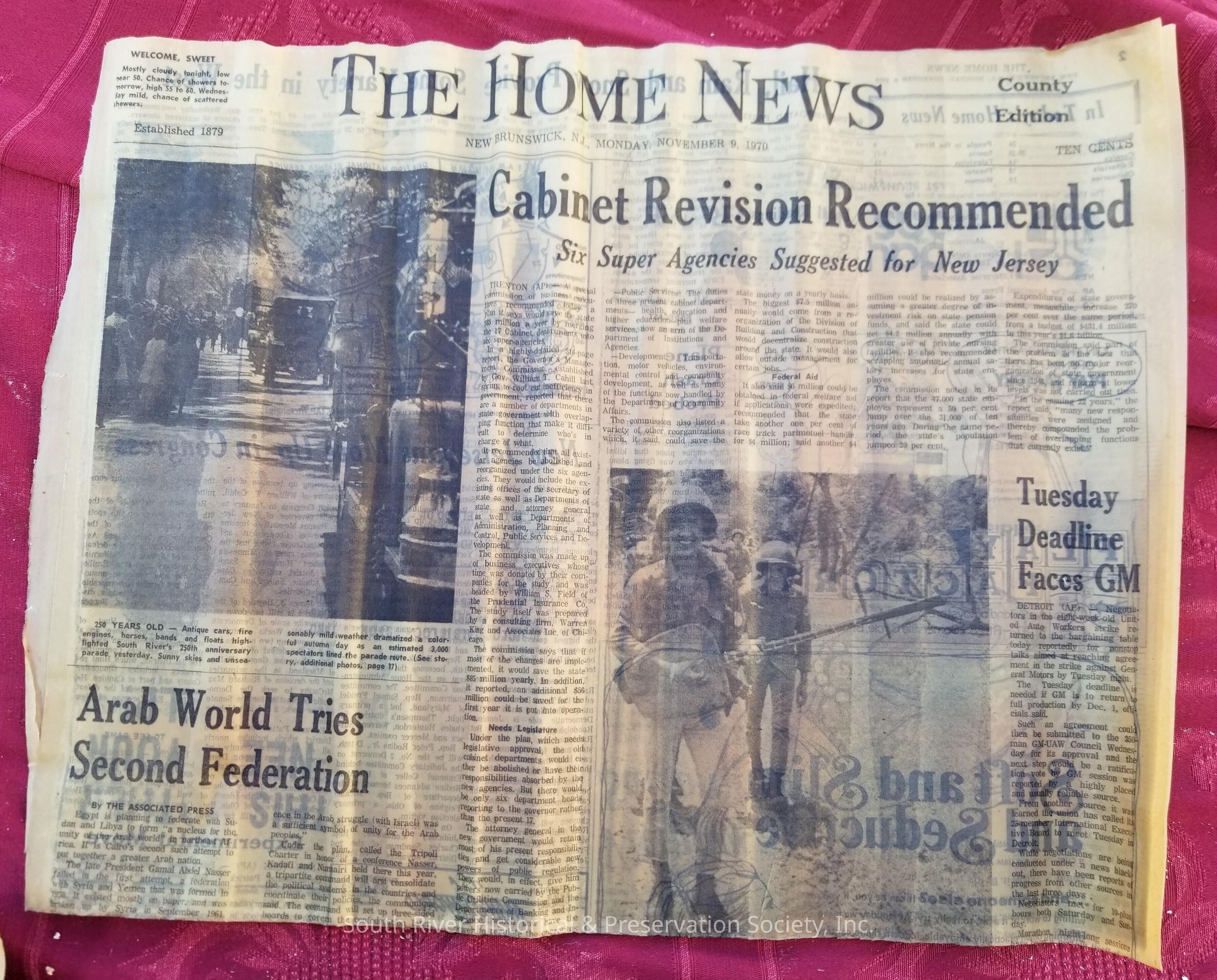 Page from the November 9, 1970 County Edition of The Home News. The photograph at the top right is from the parade for the celebration of South's River's 250th anniversary. The caption reads, "250 years old - Antique cars, fire engines, horses, bands and floats highlighted South River's 250th anniversary parade yesterday. Sunny skies and unseasonably mild weather dramatized a colorful autumn day as an estimated 3,000 spectators lined the parade route. ( See story, additional photos, page 17)"