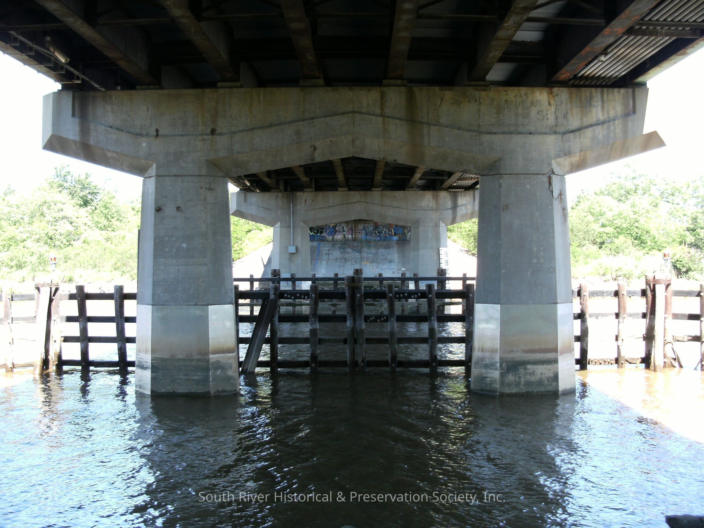 Digital color photograph taken under the Veterans Memorial Bridge looking toward the Sayreville side of the river. The bridge supports are visible along with some of the graffiti