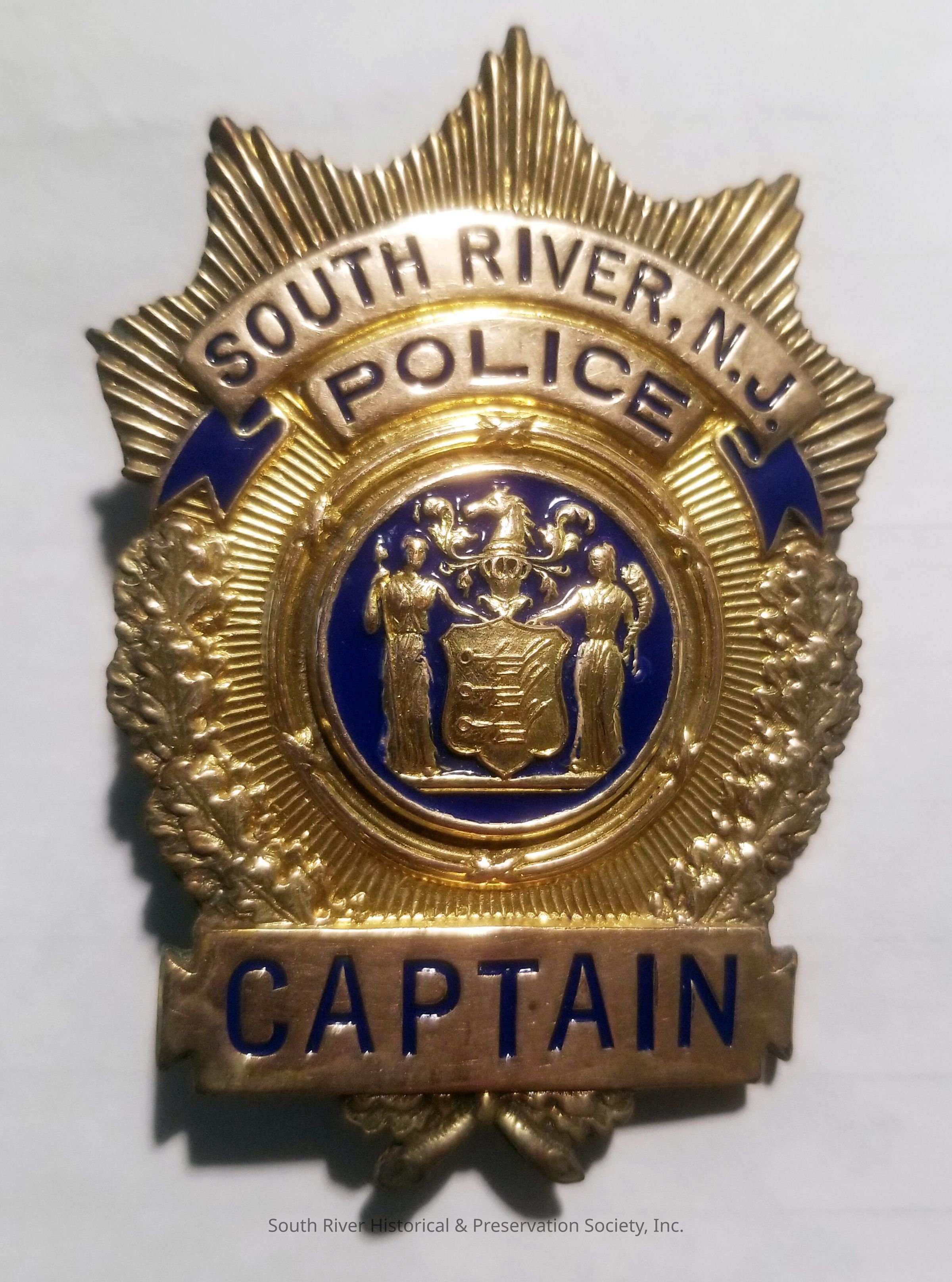 Captain's badge from the South River Police Department. "South River, N.J." is in a ribbon-shaped banner across the top with the word "Police" below. "Captain" appears in a bar across the bottom. The center design is based on the official New Jersey seal. The outer edge is topped by a sun ray pattern, and the lower by a laurel leaf design.